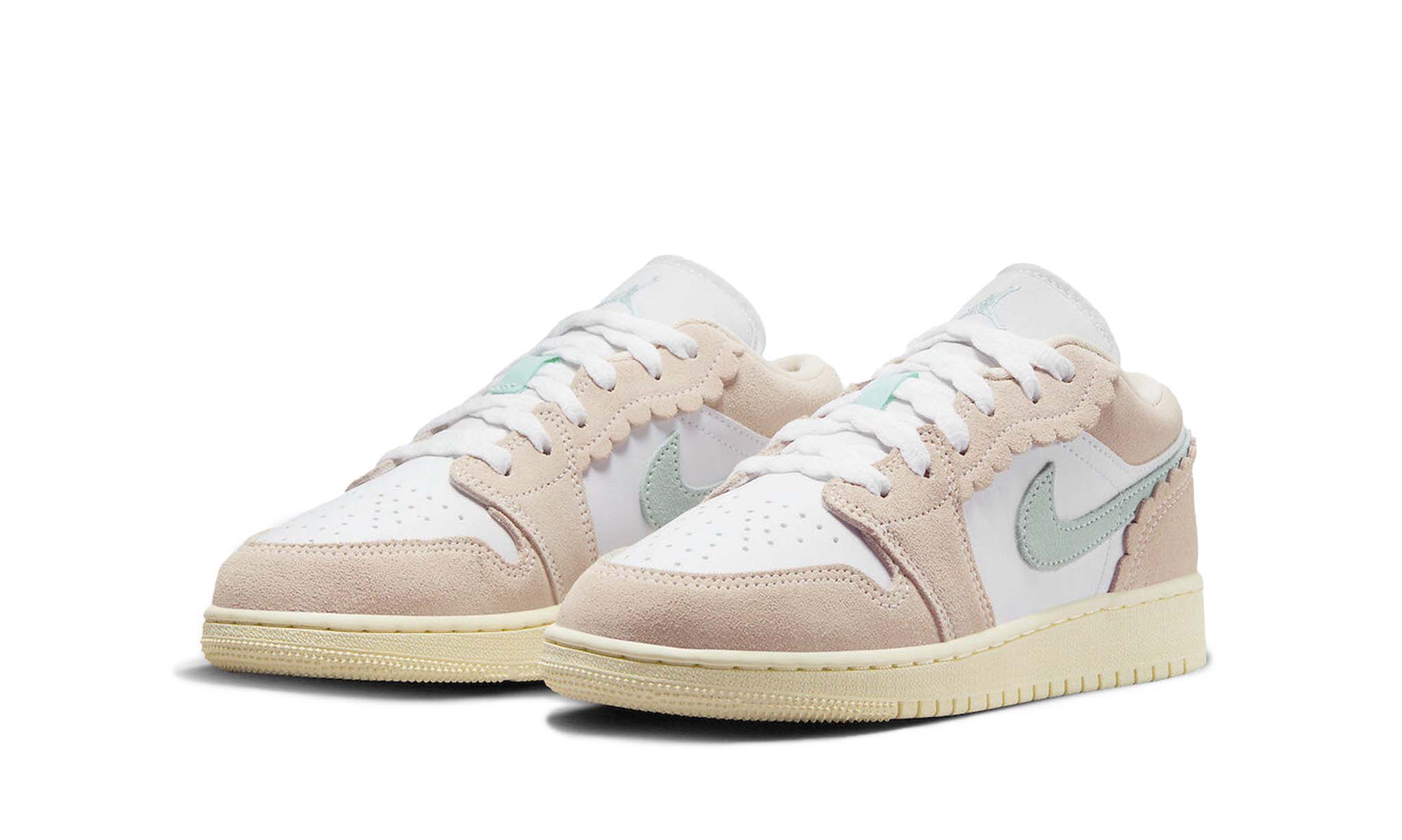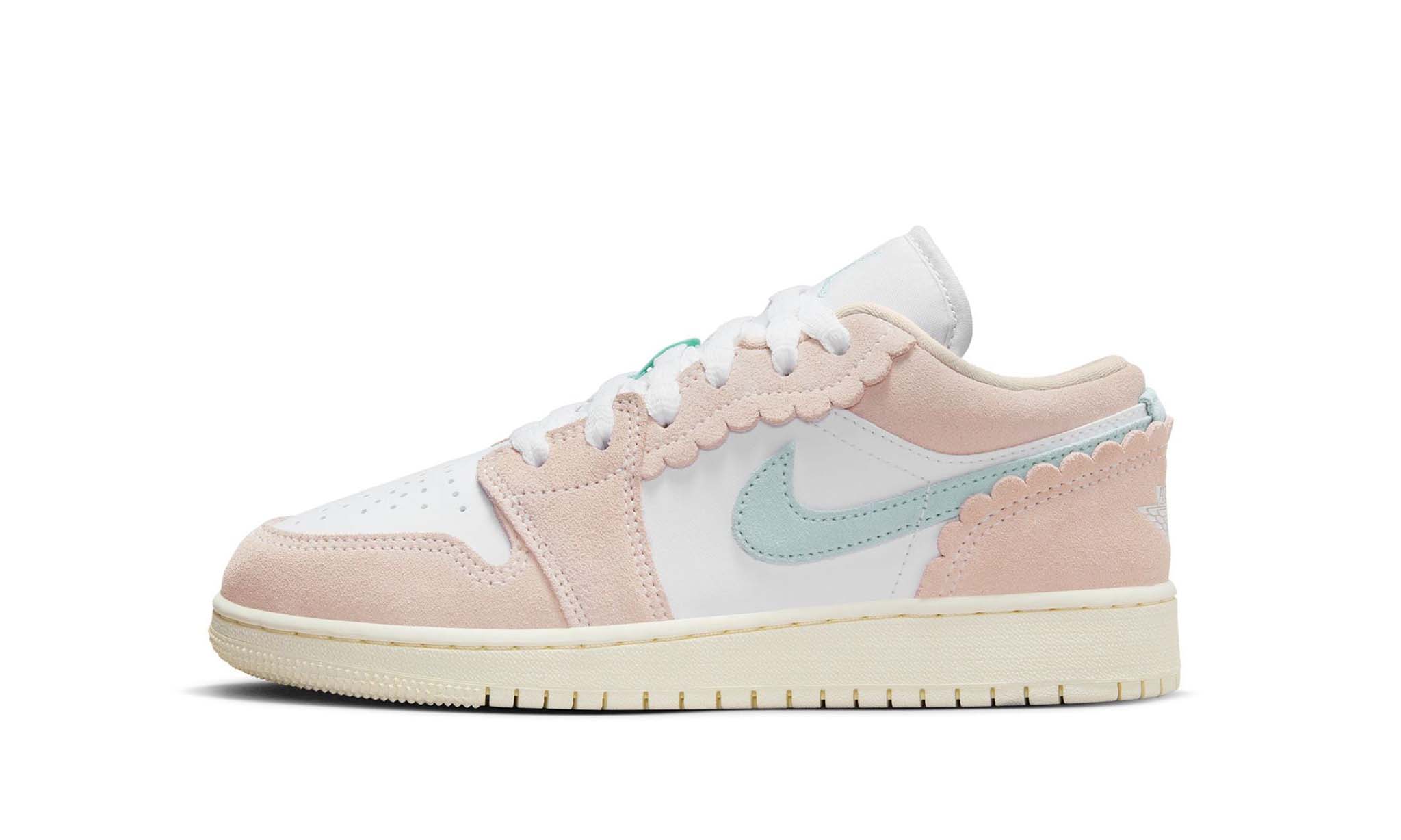This version of the Jordan 1 Low features a fresh and playful design with a white leather base, pastel pink suede overlays, and wavy edges around the eyestay and heel. Additional accents include soft blue Swooshes, Jumpman logos, and a sail-colored rubber sole, making it stand out as both stylish and youth-friendly