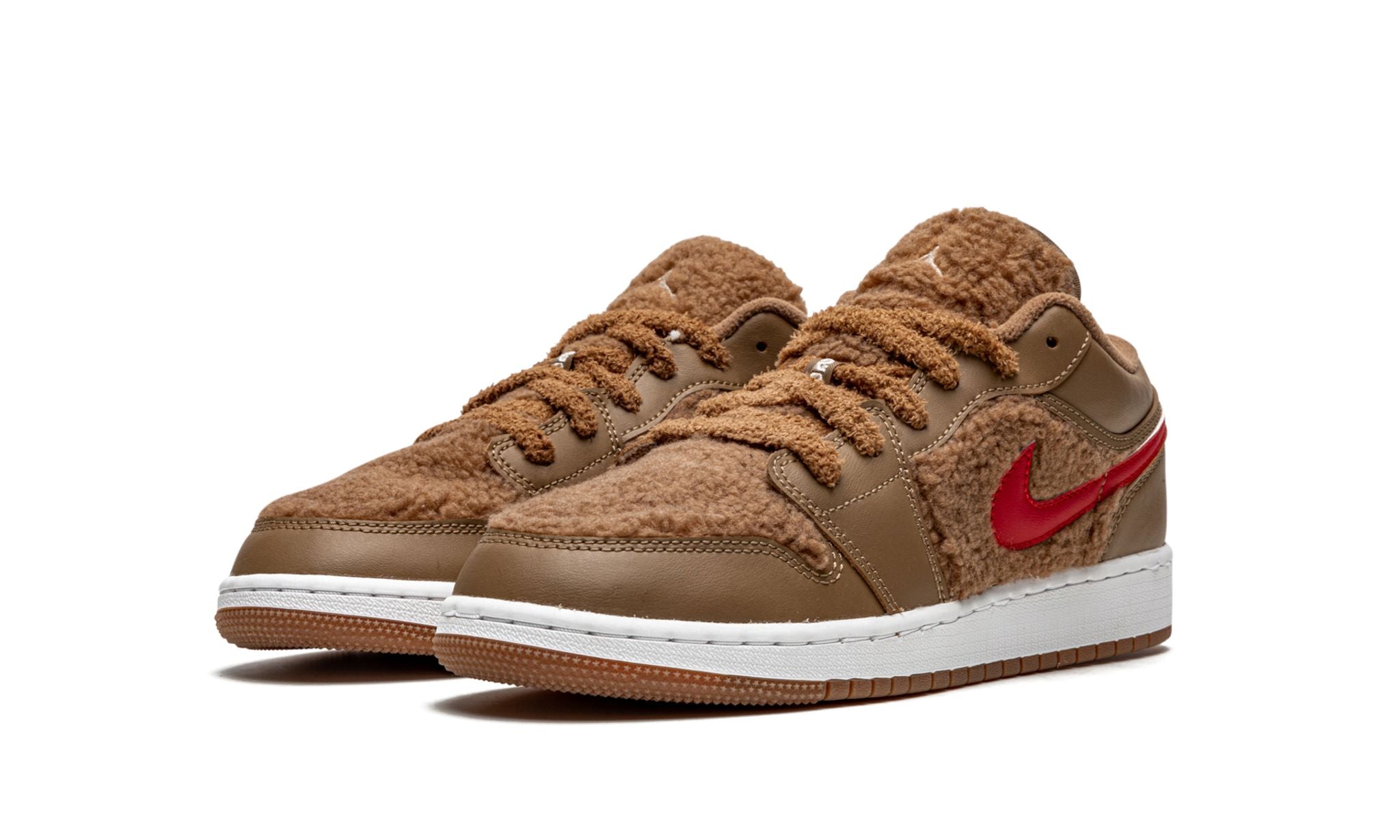 he Air Jordan 1 Low Utility Teddy Bear GS shoes feature a plush and cozy design with a fleece-like inner lining. The signature Nike swoosh is multi-colored. On the heel, you will find a very retro-feeling Air Jordan logo. Even the laces have a fleece look to them as well as fleece panels on the outer parts of the shoe. The vibrant white soles really pop against all of the colors of the shoe.
