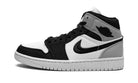 The Light Steel Mid SE Air Jordan 1 design incorporates a Crisp White foundation, complemented by black and gray overlays on the forefoot and heel. Noteworthy branding details consist of a finely embroidered black Swoosh, a Jumpman tongue tag, and a meticulously stitched Wings logo adorning the lateral ankle area. This mid-top silhouette for women is supported by a white rubber cupsole, housing an Air-sole.
