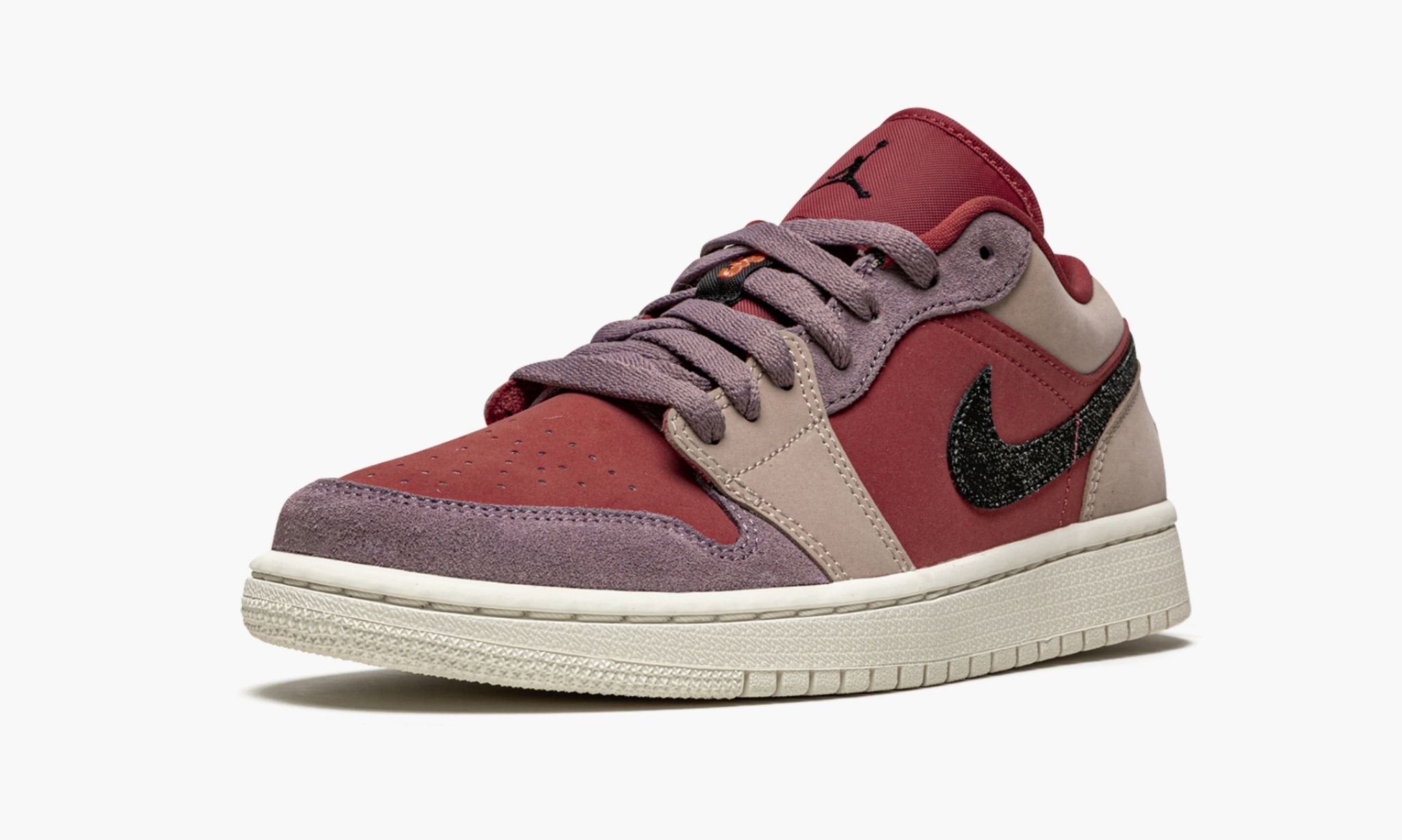 The Women’s Air Jordan 1 Low “Canyon Rust” is a women’s version of Michael Jordan’s first signature shoe in a unique mix of tones. Yet another vibrant look for the popular low-top Jordan 1, the “Canyon Rust” features synthetic nubuck panels in Canyon Rust on the perforated toe and on the mid-panel and on the nylon tongue. Beige overlays appear on the forefoot, lower eyelets, collar, and heel. Elsewhere, buttery Purple Smoke suede detailing can be found on the toe cap and upper eyelets and the same shade of dusty purple is used on the laces. A black Swoosh with glitter speckling appears on either side and a black “Wings” logo is embroidered on the heel.