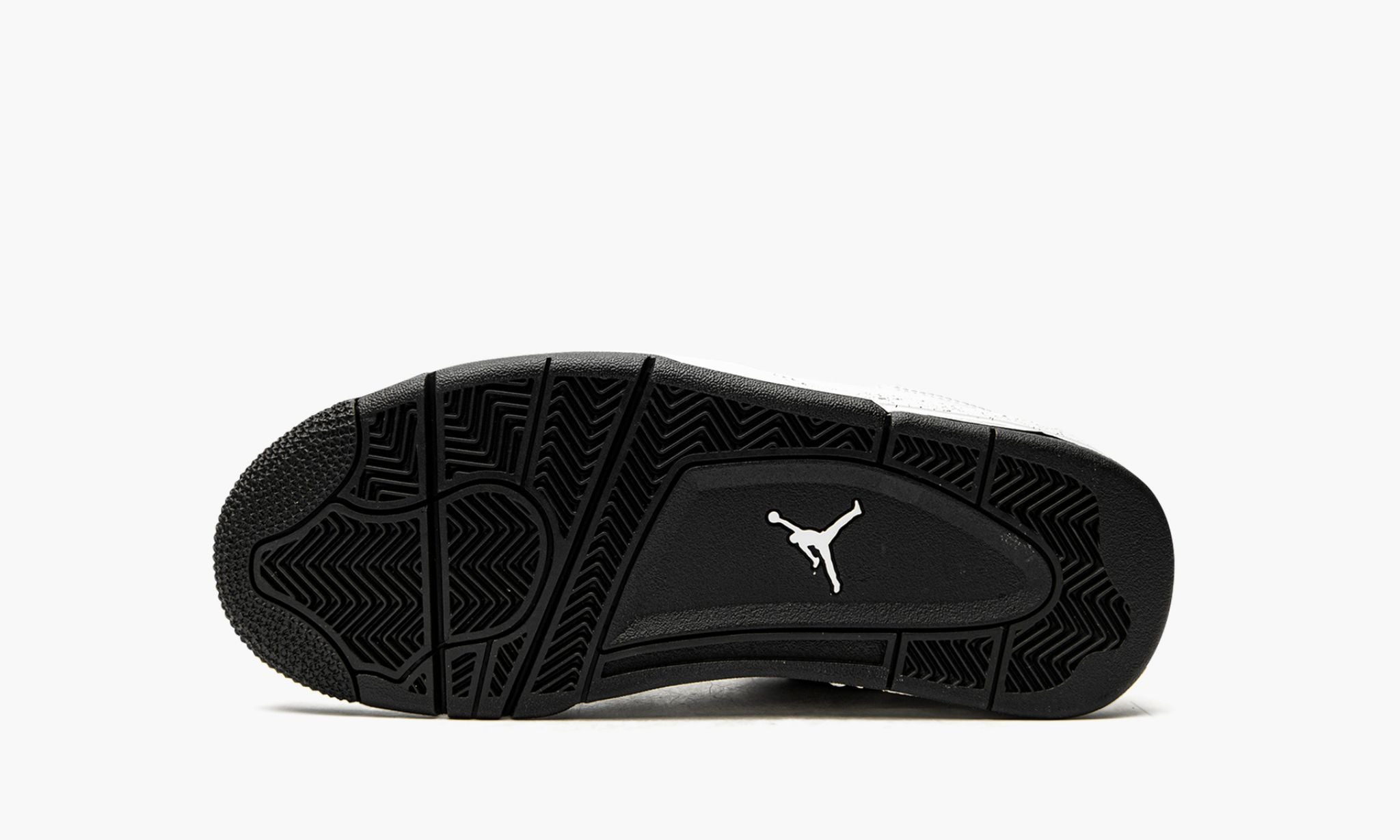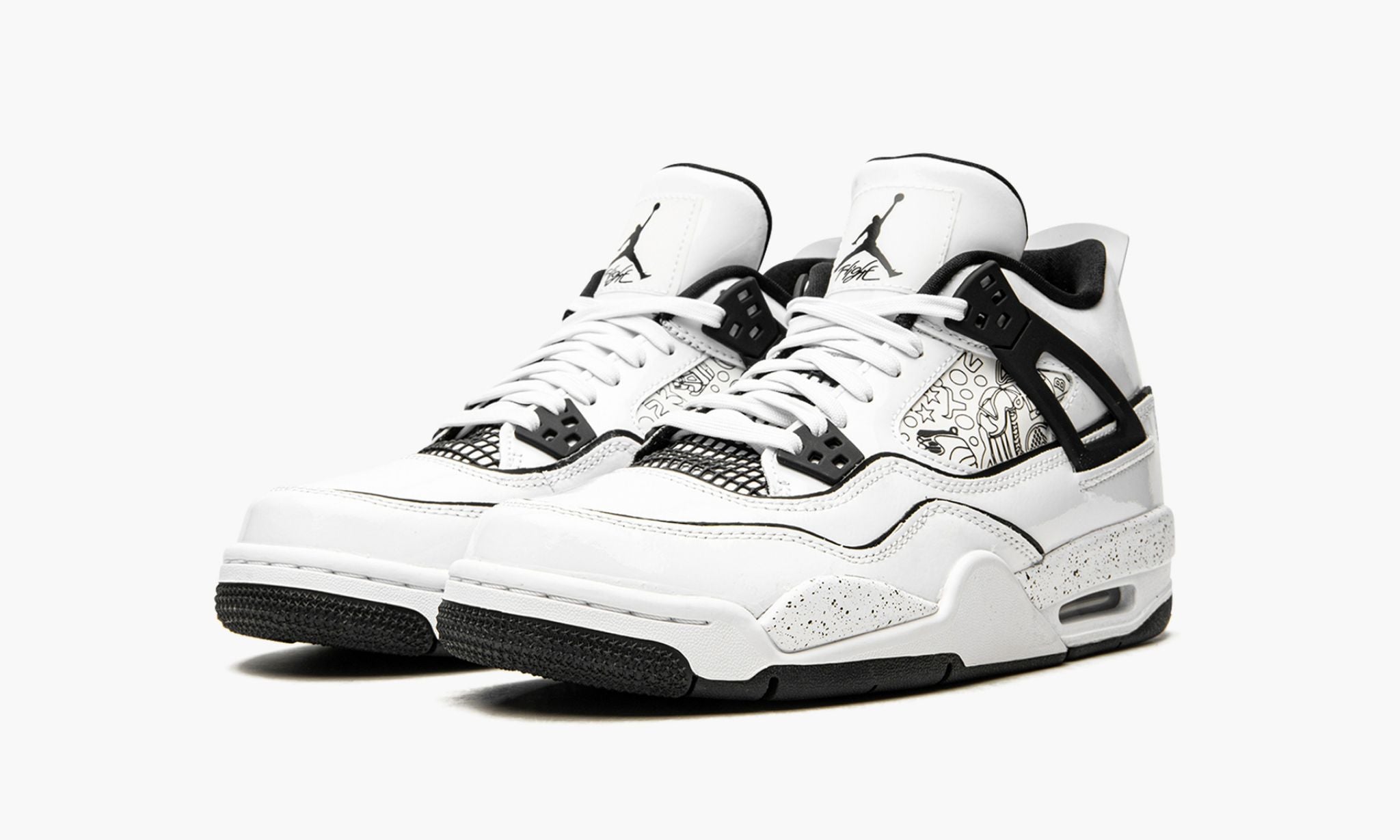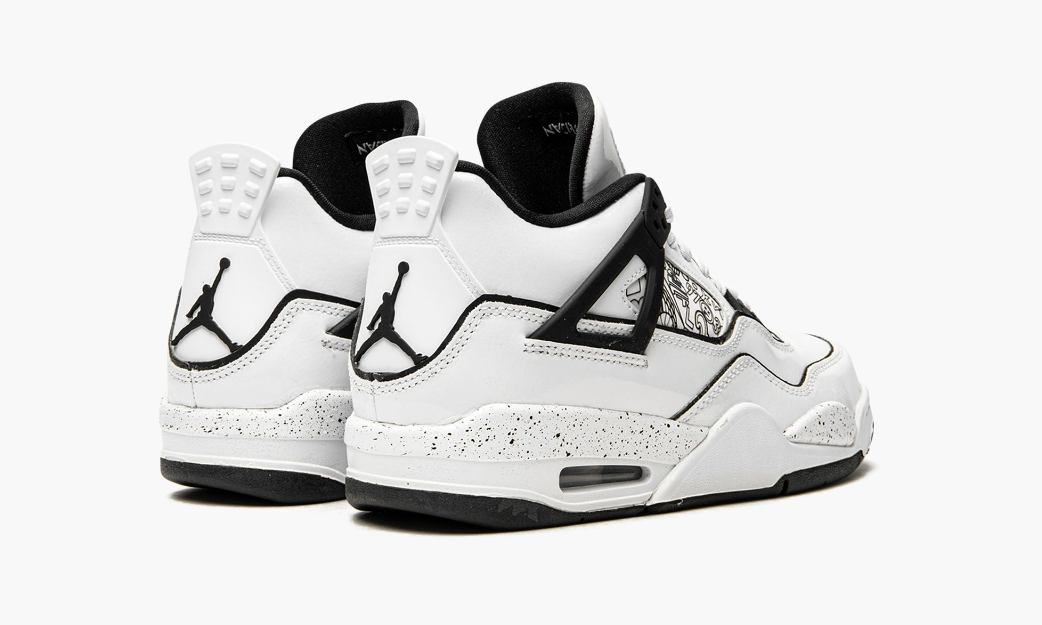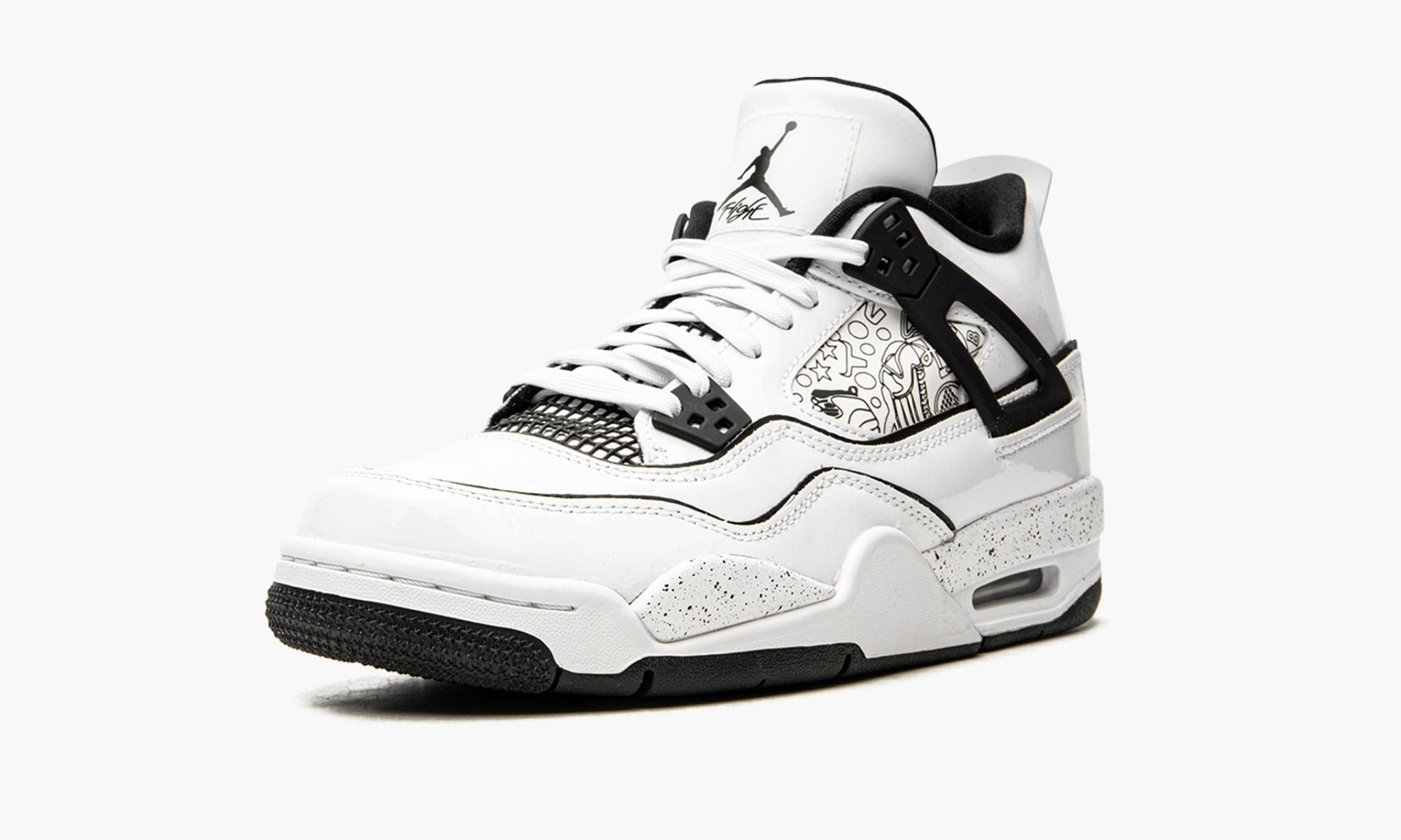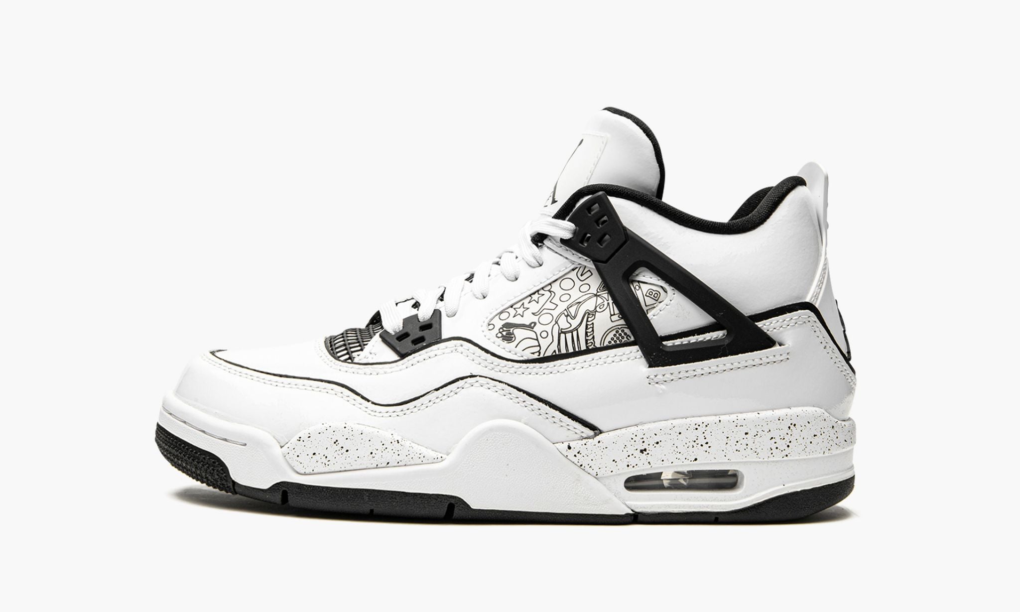 The Air Jordan 4 GS “DIY” is a youth-sized variation of Michael Jordan’s fourth signature shoe that receives a “do-it-yourself” inspired makeover with abstract details on its panels. Appearing as a “blank canvas” of sorts, the “DIY” version of the vintage basketball shoe features a crisp white tumbled leather upper with black “wings” on either side. The netting that appears on the original Air Jordan 4’s mid-panel is replaced with pen-like imagery on the sides, thus the “do-it-yourself” nickname. The wearer is encouraged to color in the graphics however they like. The shoe retains its original plastic netting on the lower tongue. A black Jumpman is found on the heel and a black Jumpman appears above the word “Flight” on the tongue. Black piping outlines the panels on the upper. The small visible Air bubble in the heel is a true-to-original design component of the original Air Jordan 4.