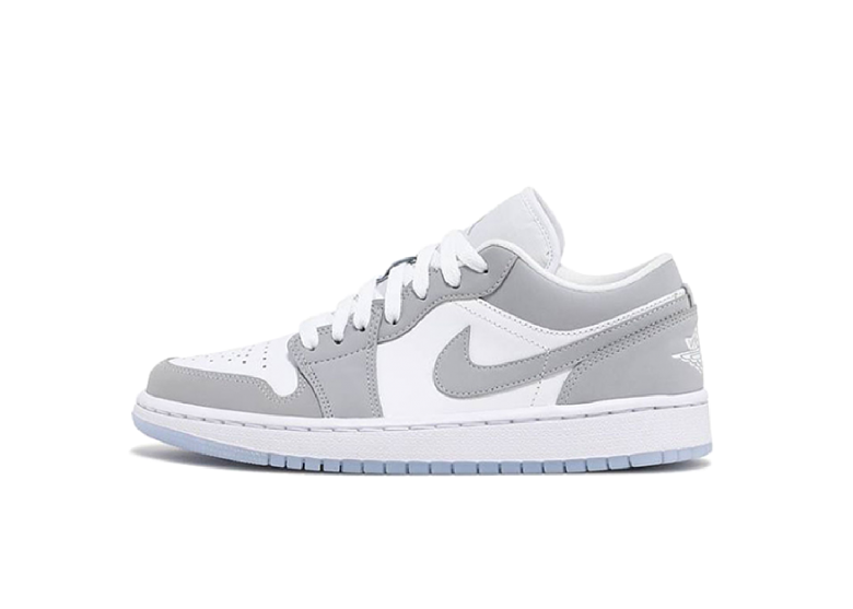 The women's Jordan 1 Low Wolf Grey (Women's) features a white leather upper with Wolf Grey Durabuck overlays and Swooshes. From there, a Jordan Wings logo on the heel and a translucent outsole adds the finishing touch.
