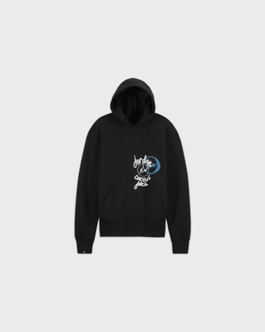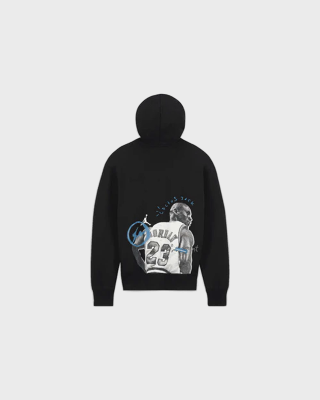 This black Travis Scott x Jordan x Fragment Hoodie was released as a part of a six piece apparel collection. The front of the hoodie features a Travis Scott x Jordan x Fragment logo. The back of the hoodie shows off a black and white graphic of Michael Jordan surrounded by all three brands' logos.