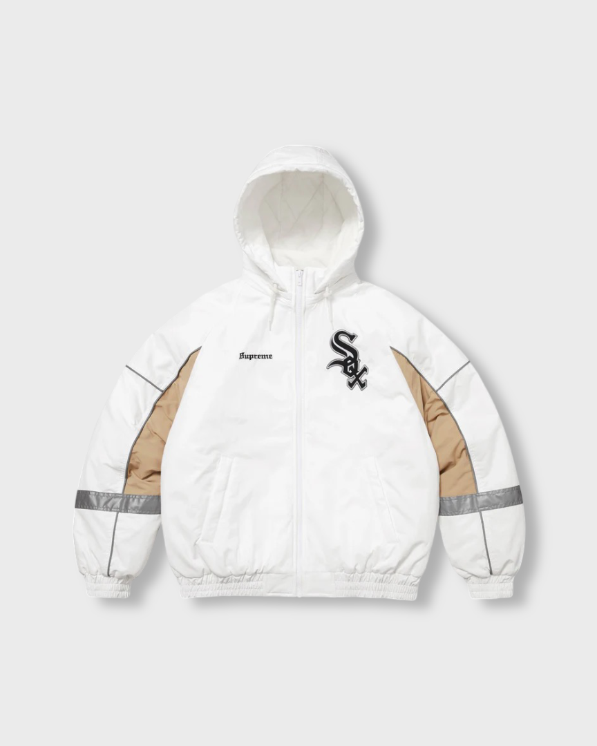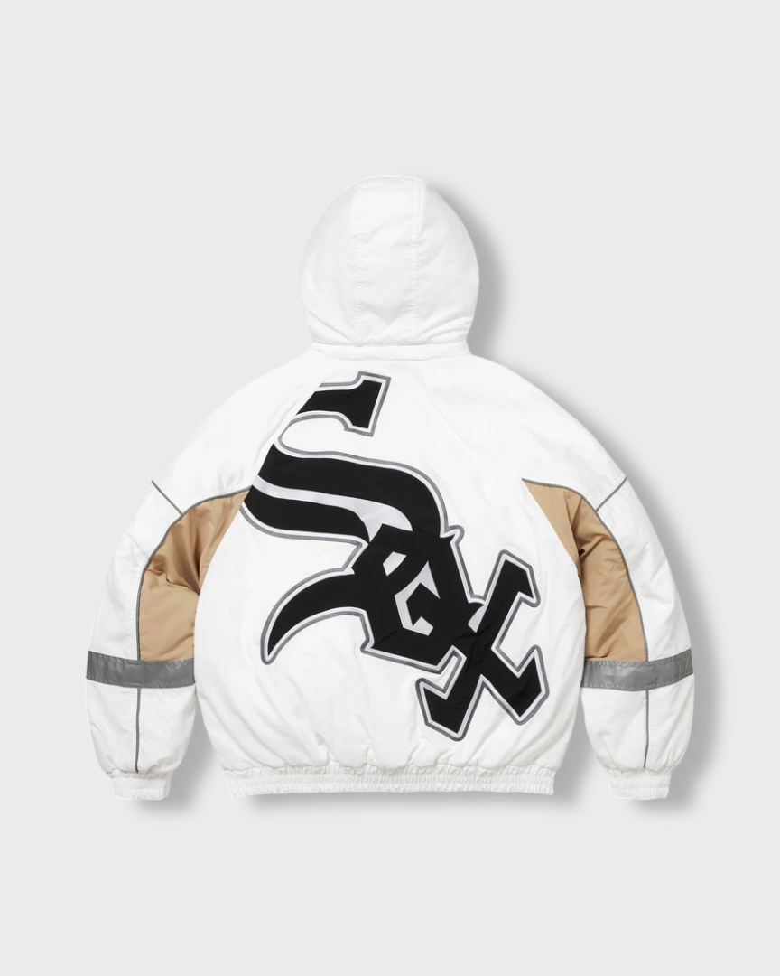 Water resistant Supplex® nylon taslan with 3M® Thinsulate™ insulation and quilted taffeta lining. Full zip closure with welt zip hand pockets at lower front and interior chest pocket. Removable hood with elastic cuffs and hem. 3M® Reflective piping and stripe at cuffs. Embroidered logos on chest and back neck. Graphic appliqué at chest and back. Official White Sox™ merchandise made exclusively for Supreme.