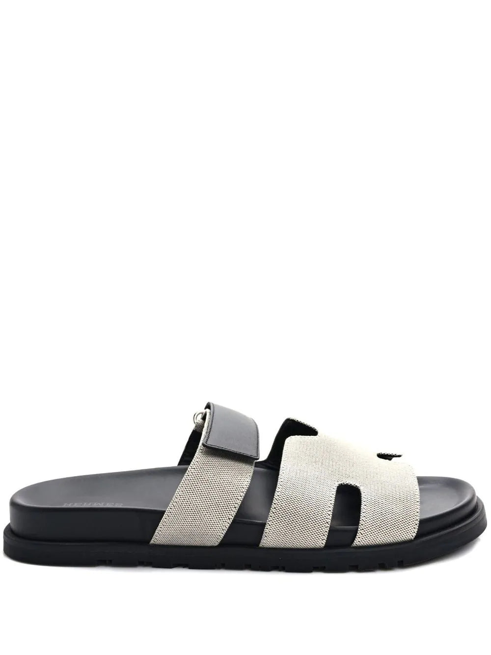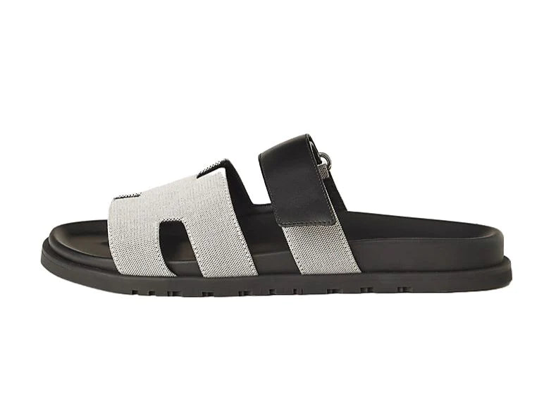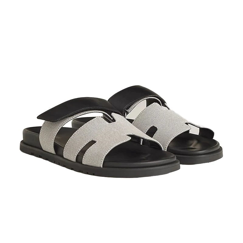Techno-sandal in H canvas and calfskin with anatomical rubber sole and adjustable strap.