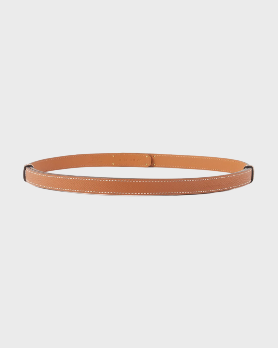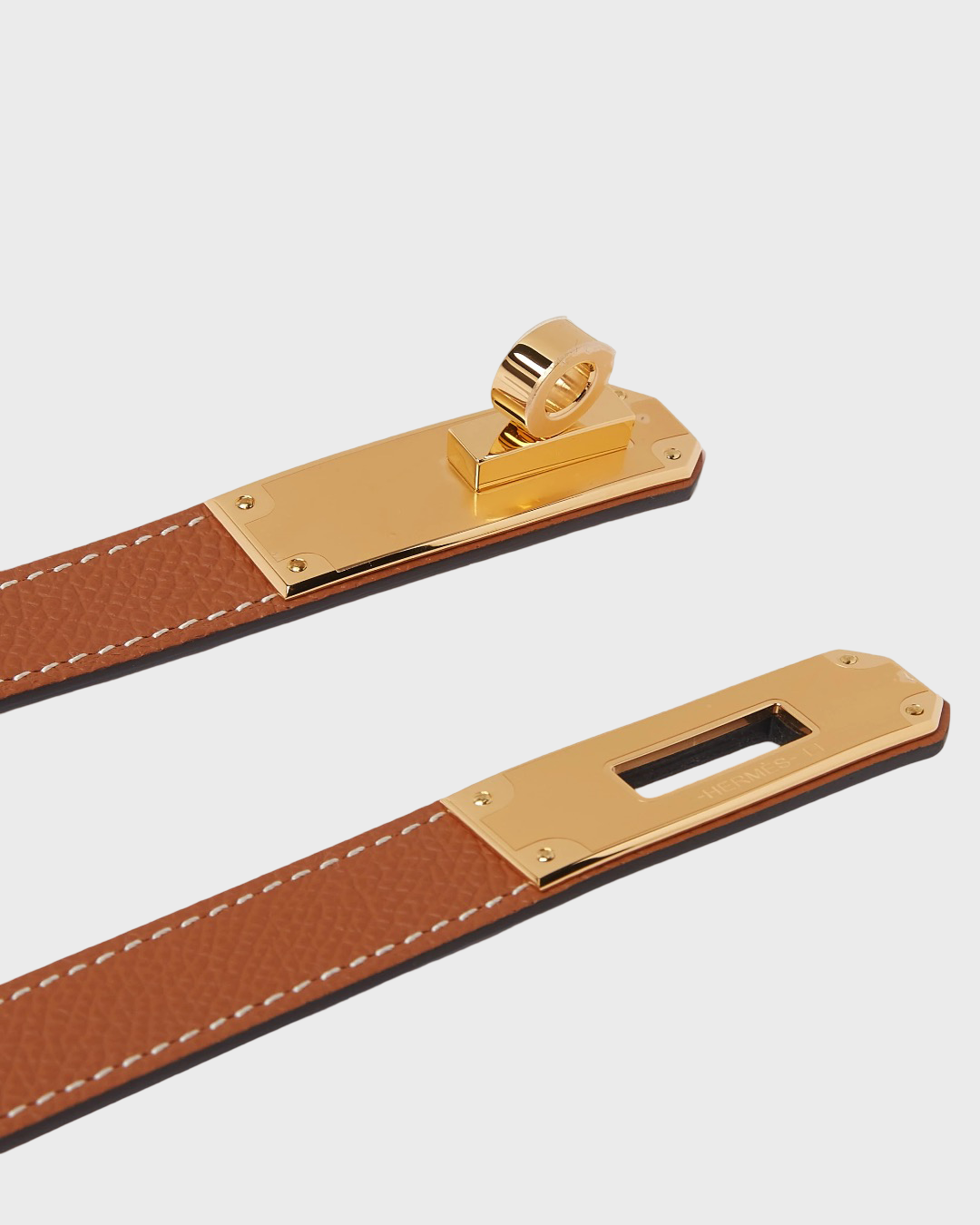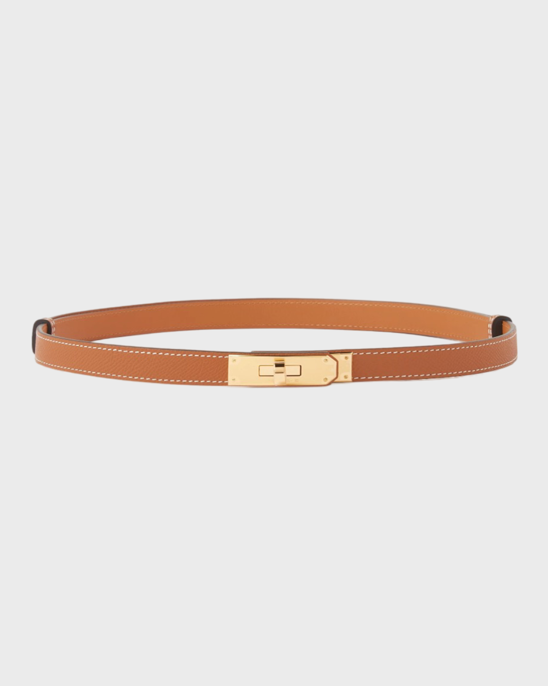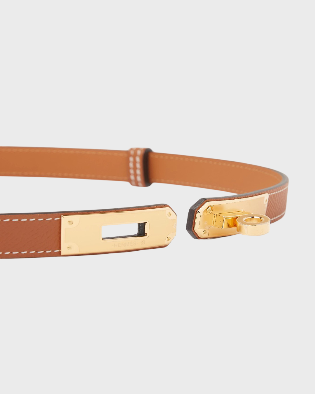 The Hermès Kelly 18mm Belt in Brown with Gold Hardware is crafted from luxurious Epsom calfskin leather and features the signature Kelly buckle in gold-tone hardware. The belt is adjustable with a sliding system, allowing it to be worn at different waist or hip sizes. This timeless piece is both elegant and versatile, embodying Hermès' refined craftsmanship