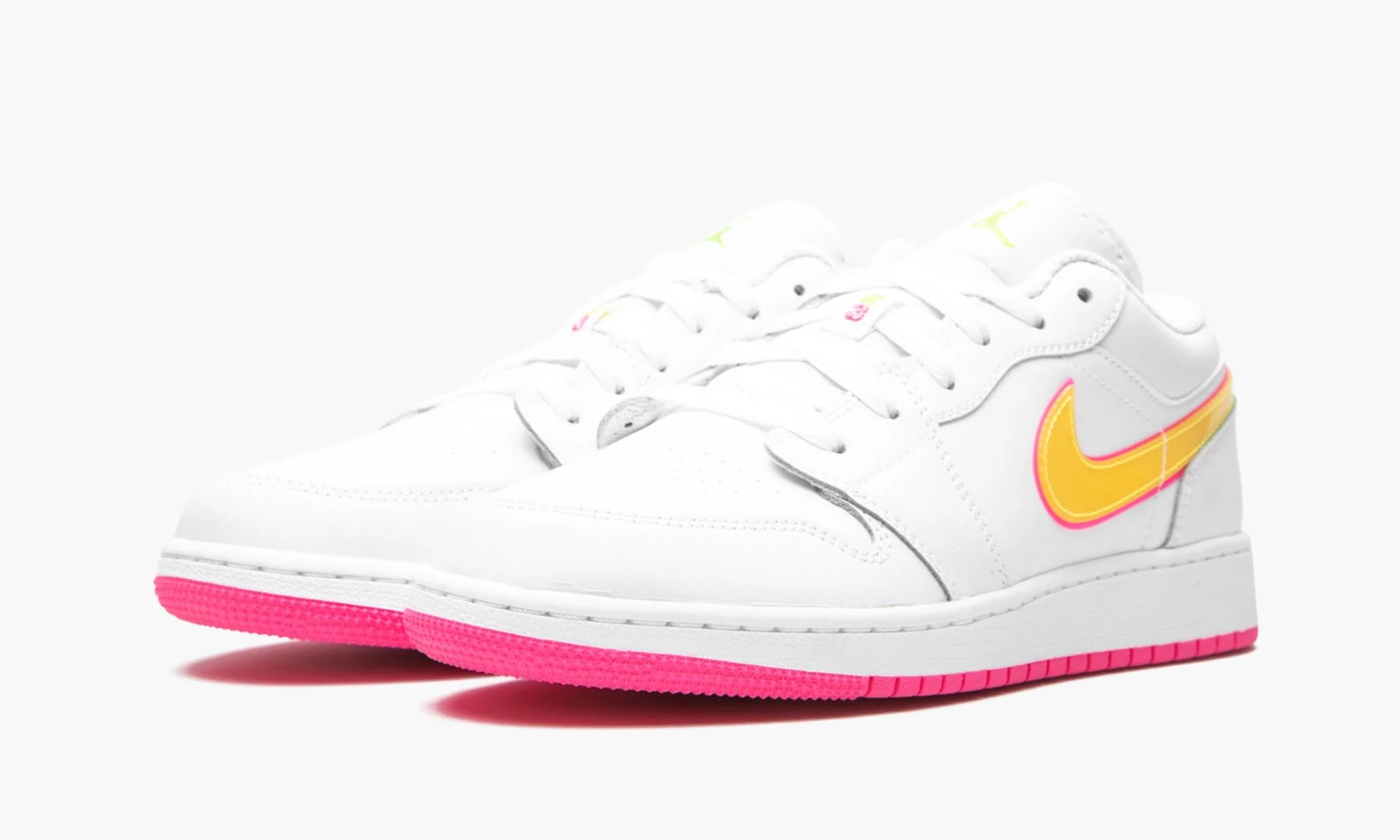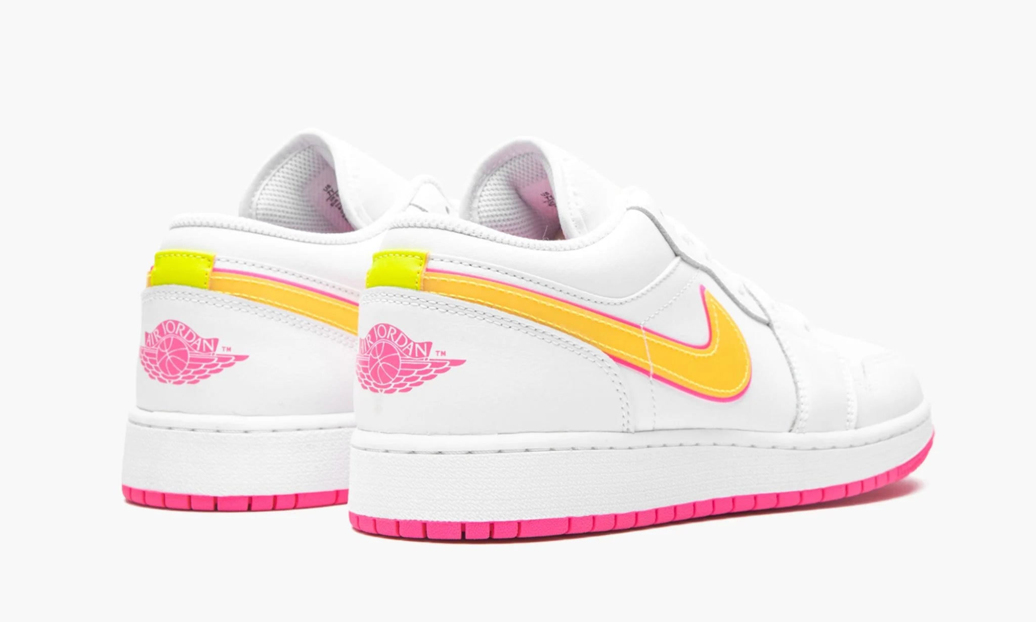 The Air Jordan 1 Low GS “Edge Glow” is the youth sizing of the summertime inspired colorway of Michael Jordan’s first signature shoe. In low-top form, the Air Jordan 1 Low is wearable, comfortable, and always in style. Those superlatives describe the “Edge Glow,” as well. The upper features smooth white leather on the mid-panel, collar, and heel. A perforated toe and tonal overlays on the forefoot, collar, and heel add additional styling to the look of the shoe. Jordan Brand places a Venom Yellow leather Swoosh with Pink Blast accenting on either side for a unique look that appeals to kids. Lime green and pink embroidered “23” detailing appears on the lace overlay and a small green Jumpman dots the white leather tongue to finish the look.