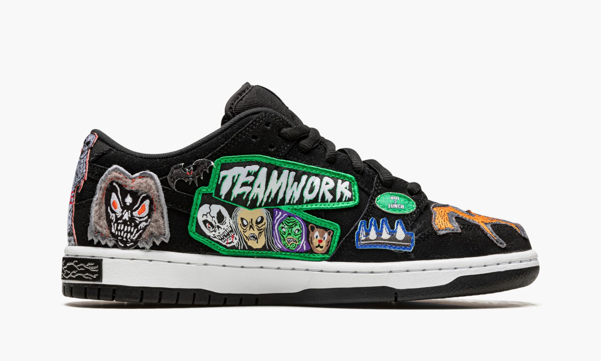 The Neckface x Nike SB Dunk Low is a collaboration between the Los Angeles based graffiti artist and Nike SB on a colorway of the skate shoe with the former’s signature graphics. A collaboration that dates back to 2013 when Neckface and Nike SB’s worked together on SB Dunk High and SB Blazer colorways, the pair renewed their relationship to great success on the SB Dunk Low in 2022. Neckface’s macabre designs appear on patches placed in an all-over style pattern on the shoe’s black suede upper. Mismatched “Nike SB” and “Neckface” branding is found on the tongue tag of the left and right shoe, respectively. A small white embroidered Swoosh appears on the lateral side of the forefoot. A “SHOCKERS” patch is attached to heel of the left shoe’s white rubber midsole. Release date: October 27, 2022