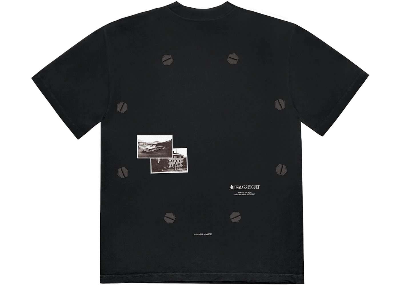 The Travis Scott CJ x Audemars Piguet Vintage T-Shirt in Black is a part of a collaboration between Travis Scott's Cactus Jack brand and luxury watchmaker Audemars Piguet. This limited-edition piece is from the Fall/Winter 2023 collection, emphasizing a blend of streetwear and luxury design. Key details include: