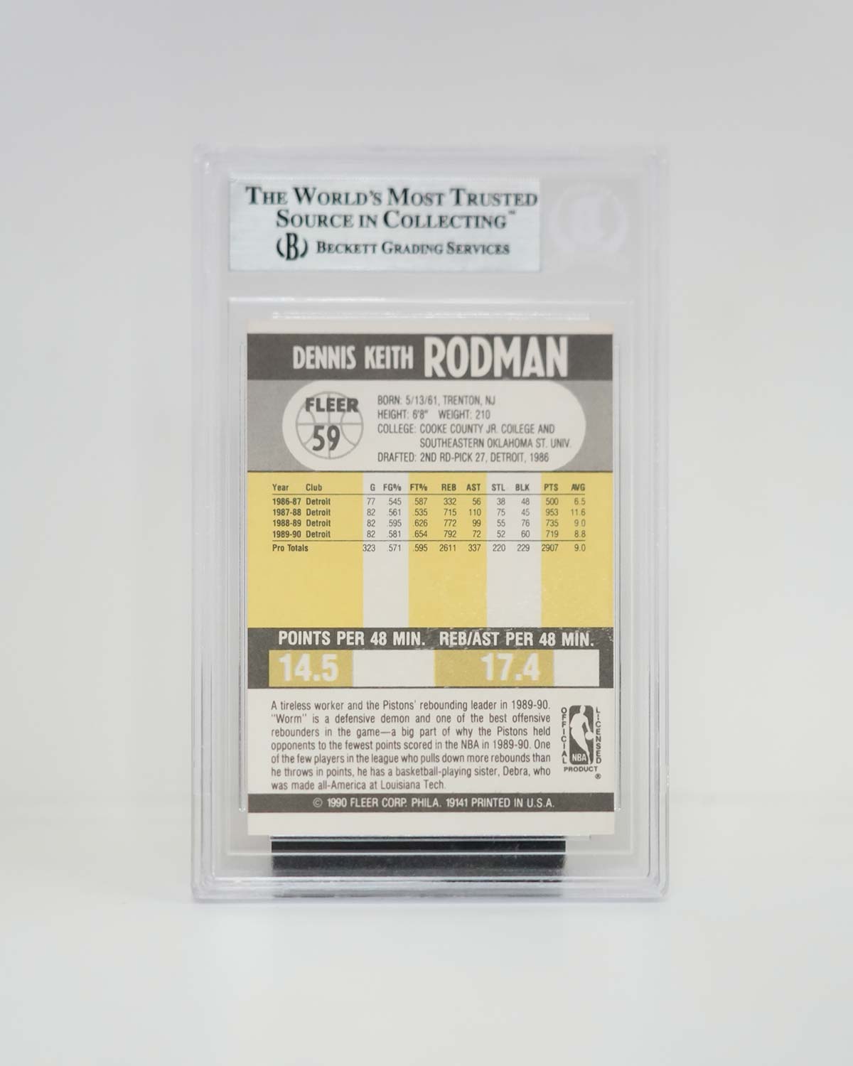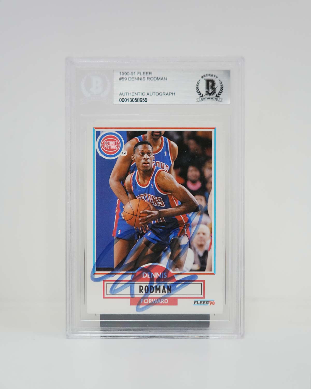 Add one of the top players in NBA history to your collection with this Dennis Rodman autographed 1990-91 #59 Fleer Card. Along with an eye-catching design, this sought-after card features the Detroit Pistons star's autograph. It's the perfect way for serious collectors and fans to celebrate the impact Dennis Rodman made on the game.