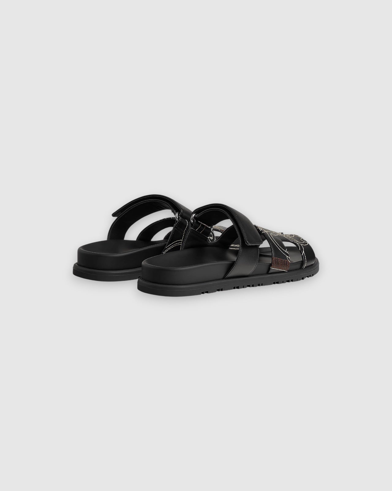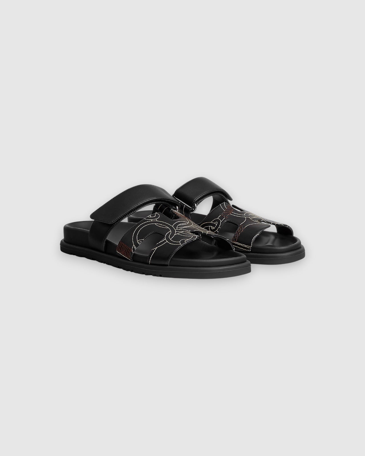 Techno-sandal in "Panoplie Equestre" embroidered calfskin with anatomical rubber sole and adjustable strap.