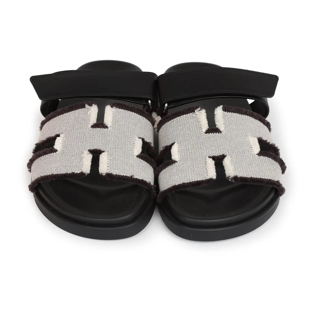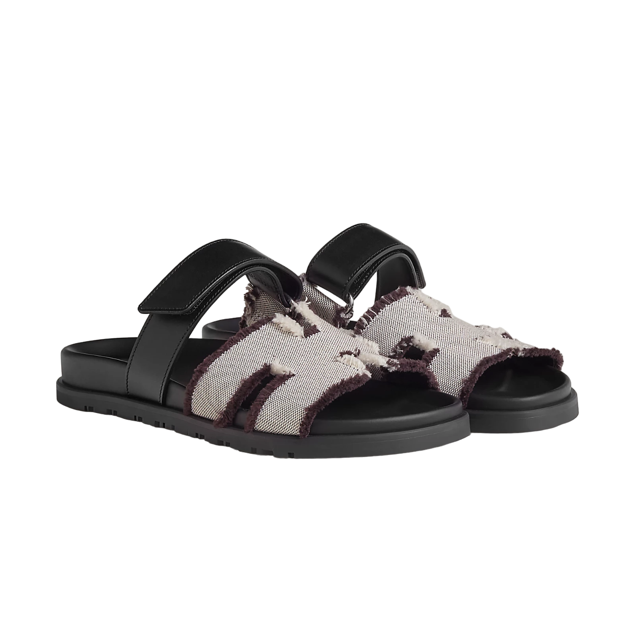 Techno-sandal in fringed H canvas and calfskin with anatomical rubber sole and adjustable strap.
