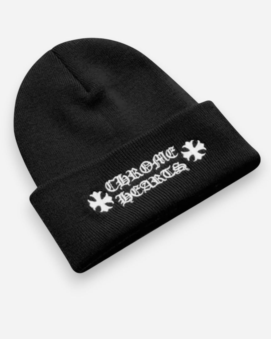 Chrome Hearts Logo Beanie – Black. Crafted from premium soft knit, this beanie combines comfort, warmth, and iconic Chrome Hearts style for a versatile accessory that complements any outfit.