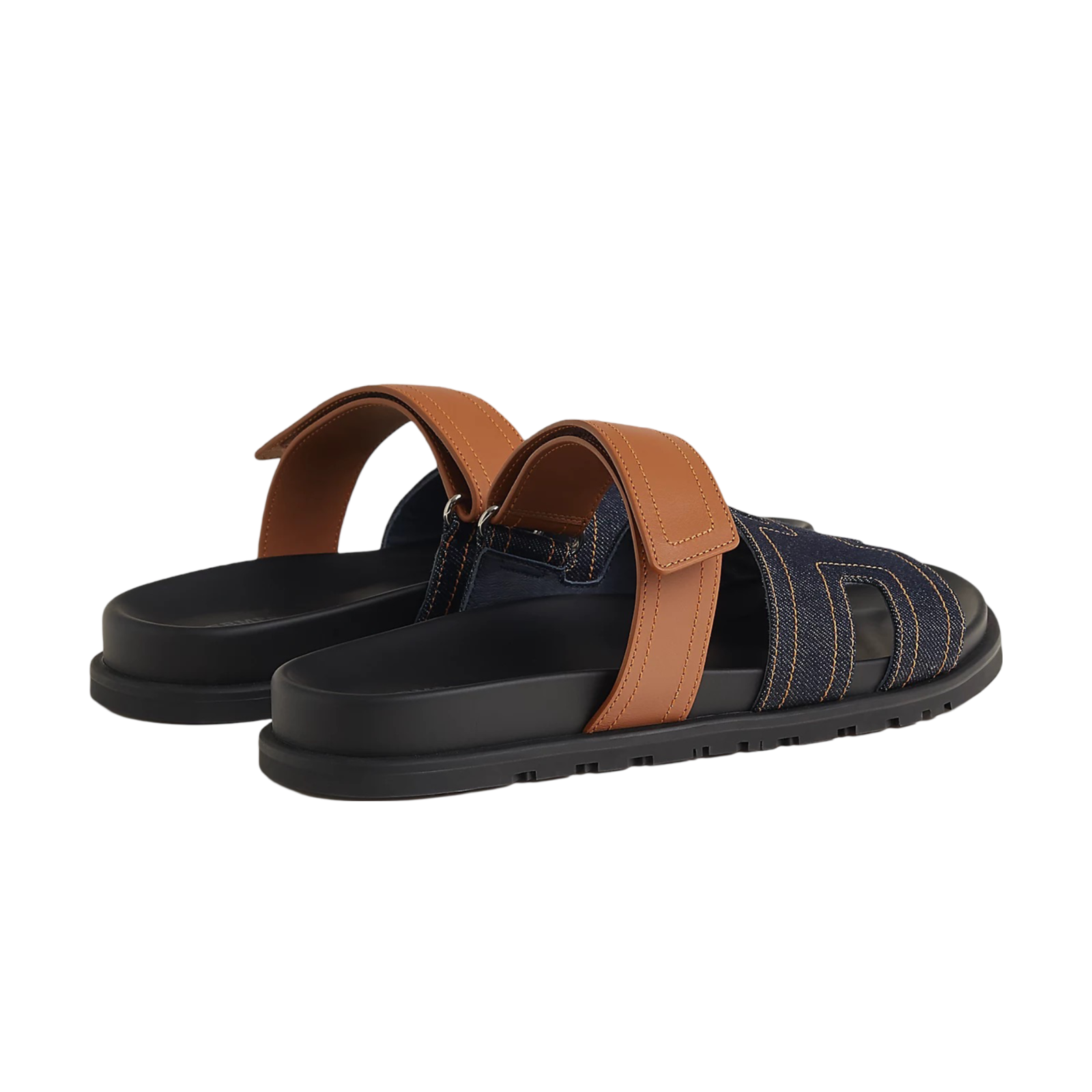 Techno sandal in denim and calfskin with anatomical rubber sole and adjustable strap.
