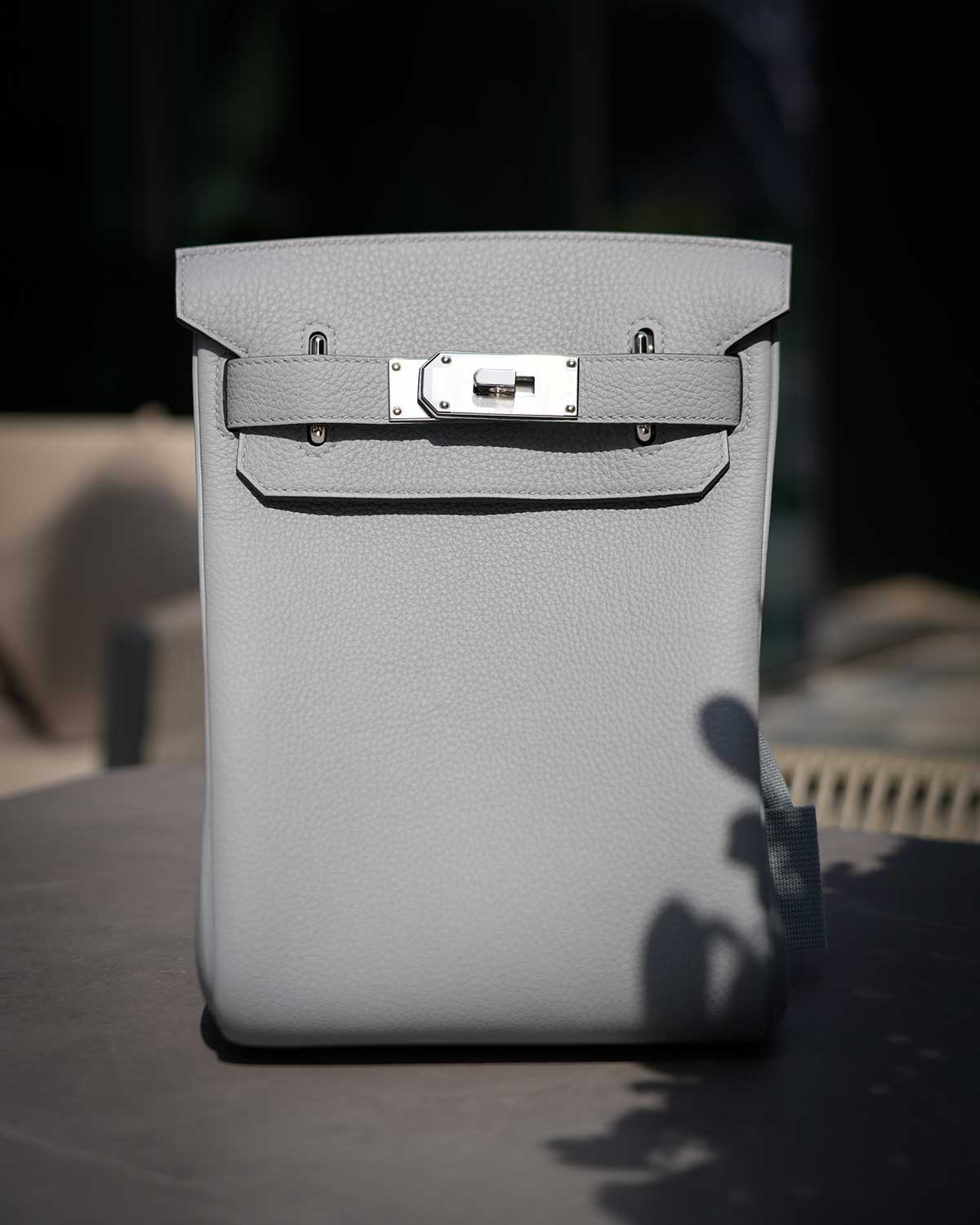 Inspired by the original Haut à Courroies travel bag, the Hac à Dos retains signature elements: the structured trapezoidal shape, dual leather straps, and polished palladium-plated turn-lock closure. Designed for versatility, it features an adjustable shoulder strap, interior pocket for essentials, and a discreet D-ring for added functionality.