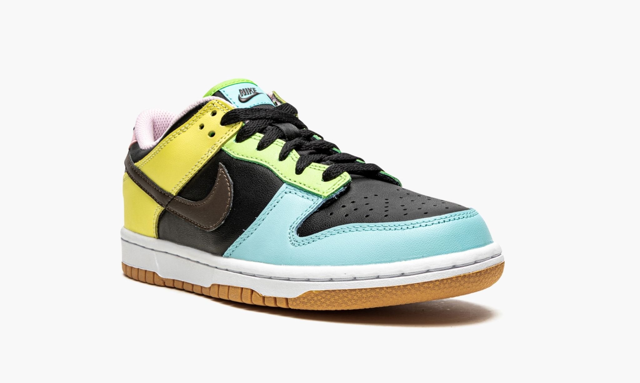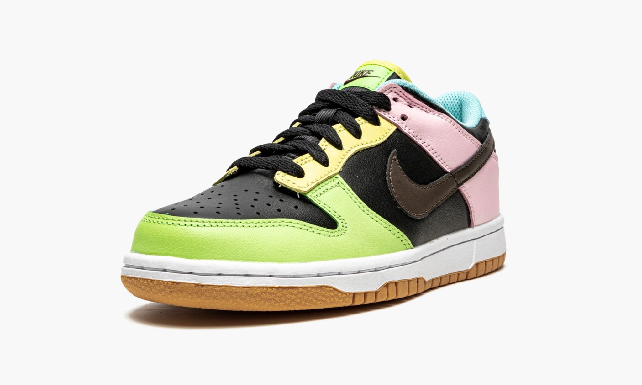 The Nike Dunk Low GS “Free 99” is the youth sizing of the black-based Dunk colorway from Nike’s “Free 99” collection. The two-pack was released by Nike in Spring 2021 and features the legendary Dunk finished off in an Easter-inspired colorway that includes soft pastel leather panels arranged in a mismatching color block. Shades of yellow, blue, pink, and green pastels can be found on the toe cap, forefoot, eyelets, collar, and heel on both the left and right shoe. A dark chocolate brown leather Swoosh resides on both sides and classic “Nike” embroidery graces the mismatched leather heel tabs. On the tongue tag, a “Nike” logo and Swoosh insignia appear on the green and blue nylon tongue tag of the left and right shoe, respectively. The look is drawn to a close with a white midsole and contrasting gum outsole