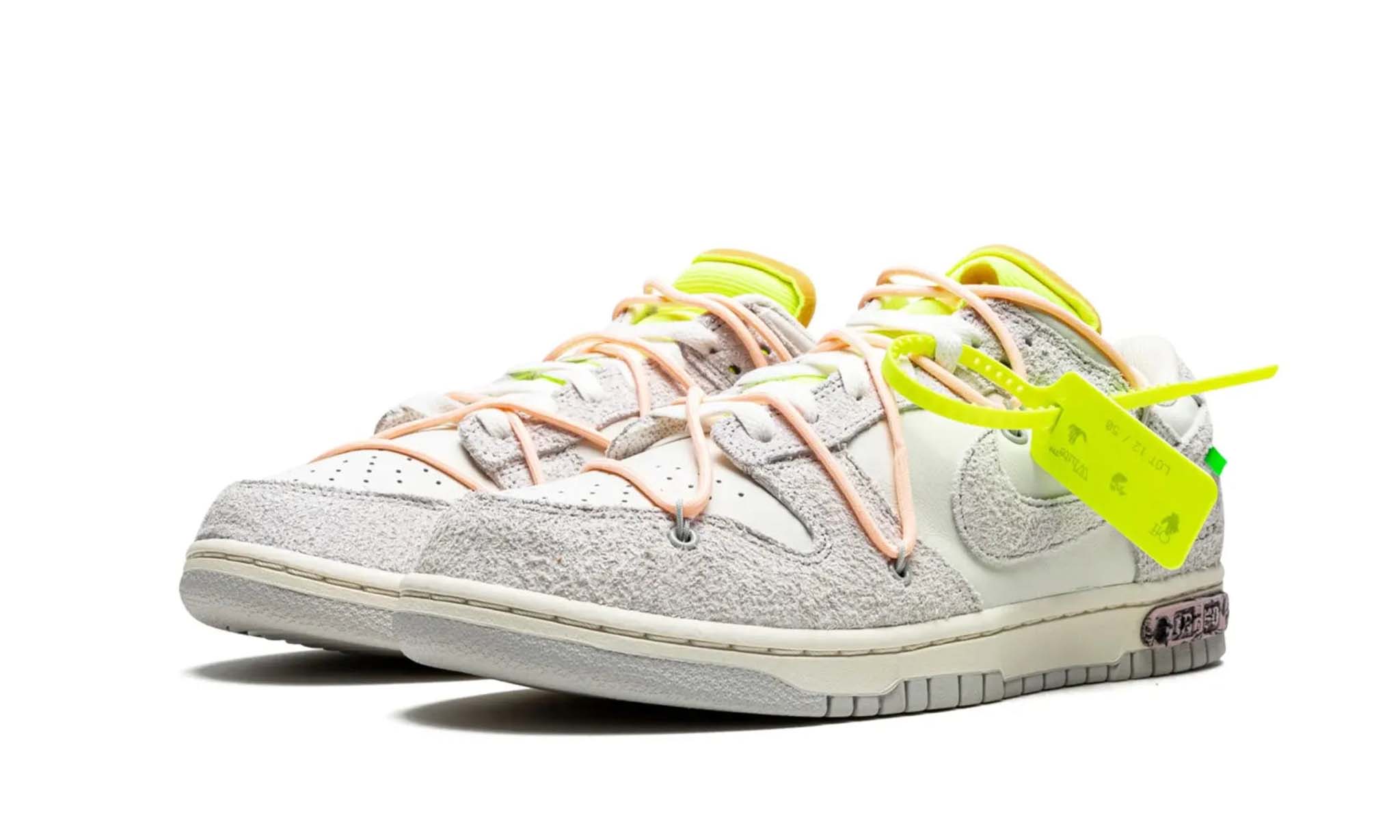 The Off-White x Nike Dunk Low “Lot 12/50” is one of fifty colorways of the retro basketball shoe created by Virgil Abloh and Nike in August 2021. The Off-White x Nike Dunk “Lot 50” collection follows the duo’s coveted “The 10” collaboration from 2017 that saw Abloh recreate deconstructed colorways of iconic Nike and Air Jordan models. On “Lot 12,” Sail canvas appears on the toe, mid-panel and collar. The overlays and Swoosh are constructed in Neutral Grey leather. Black “Nike” branding is printed on the heel and Off-White’s signature Helvetica text is found on the medial side. A secondary, bungee cord-like lacing system is added to the upper in addition to a traditional lacing setup. The look is carried over from Off-White’s first Nike Dunk collaboration from 2019. A marbled pink-and-black insert with “Lot 12 of 50” appears on the Sail midsole. Release date: August 9, 2021