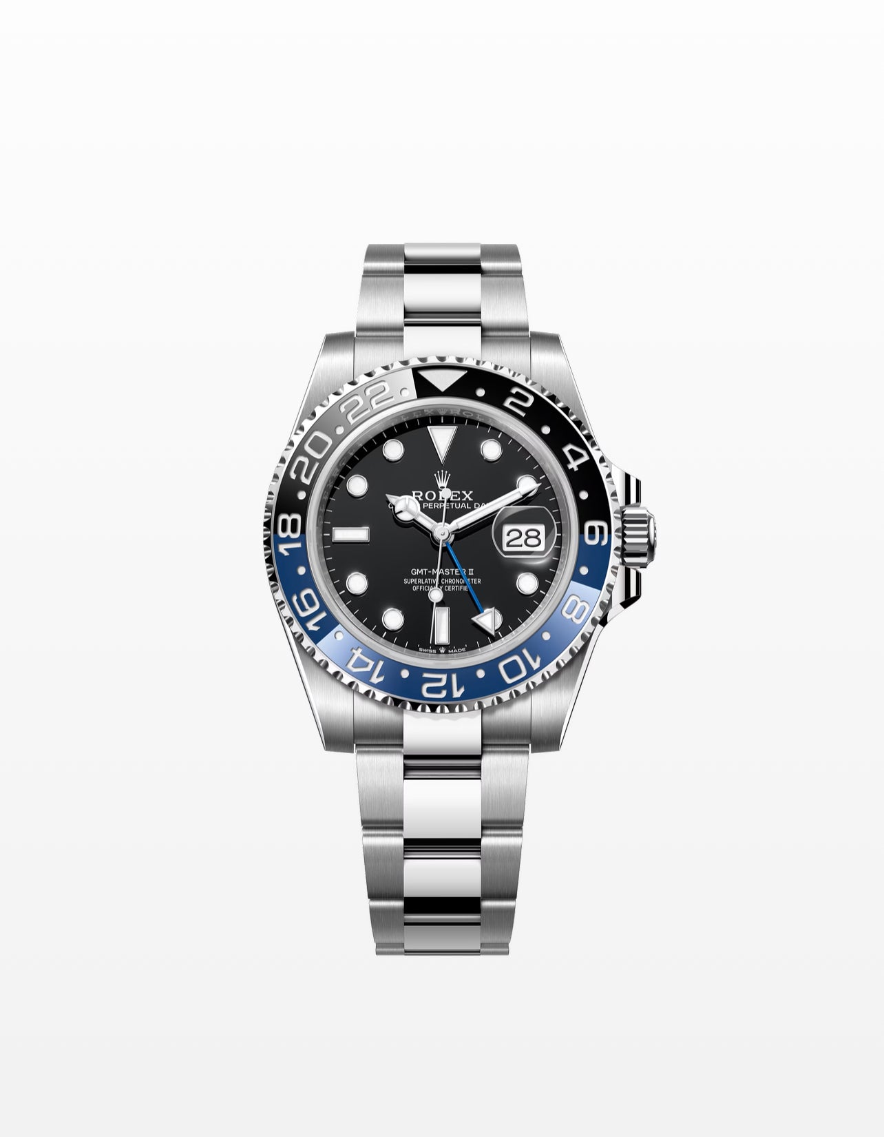 This model features a black dial and a two-colour Cerachrom bezel insert in blue and black ceramic. In addition to conventional hour, minute and seconds hands, the GMT-Master II features an arrow-tipped hand, which circles the dial once every 24 hours, as well as a bidirectional rotatable 24-hour graduated bezel.