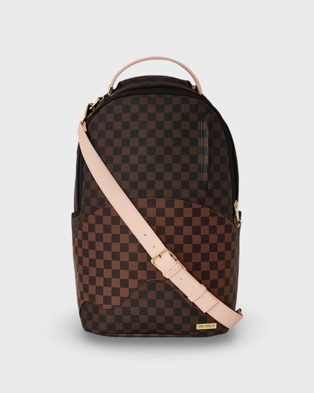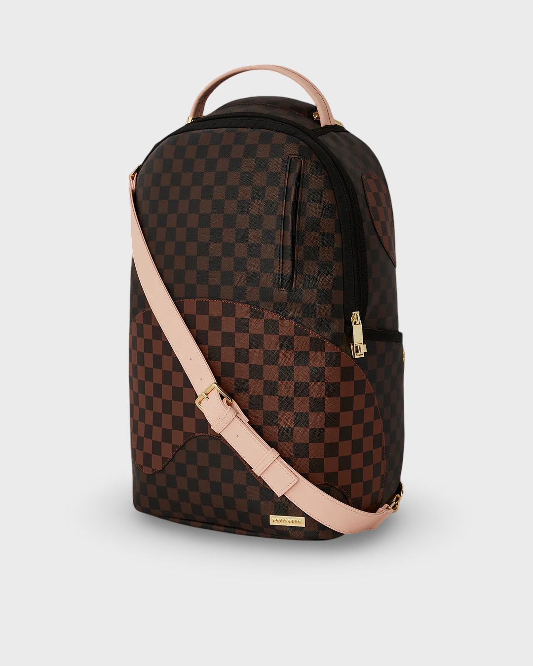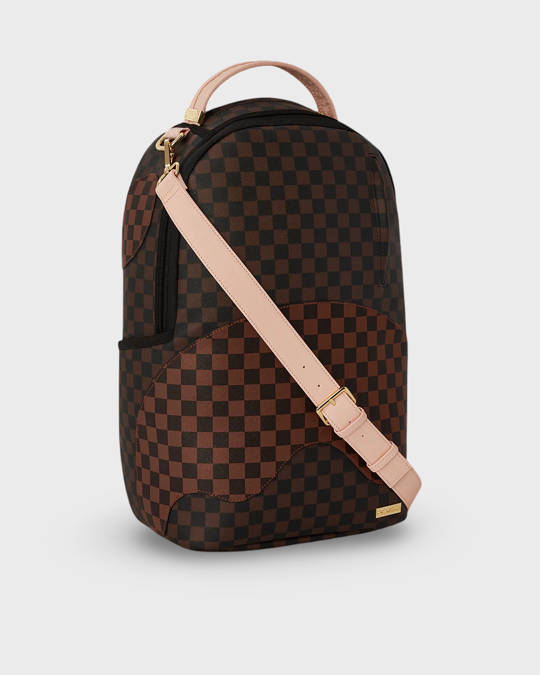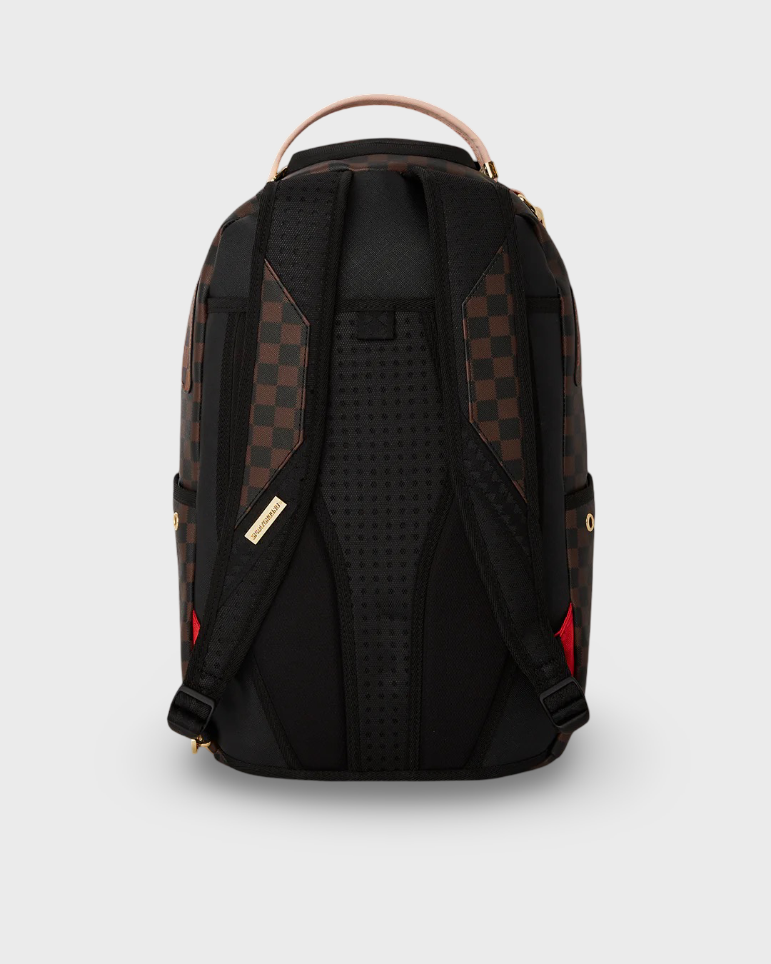 Dimensions: 18" x 6" x 11.5" • Front zipper pocket • Side pockets • Zippered Stash pocket • Separate velour sunglass compartment • Ergonomic mesh back padding • Adjustable Straps for custom sizing • Gold zippers with metal hardware • Metal "Sprayground Authentic" badge • Slide through back sleeve connects to carry-on luggage to free your hands