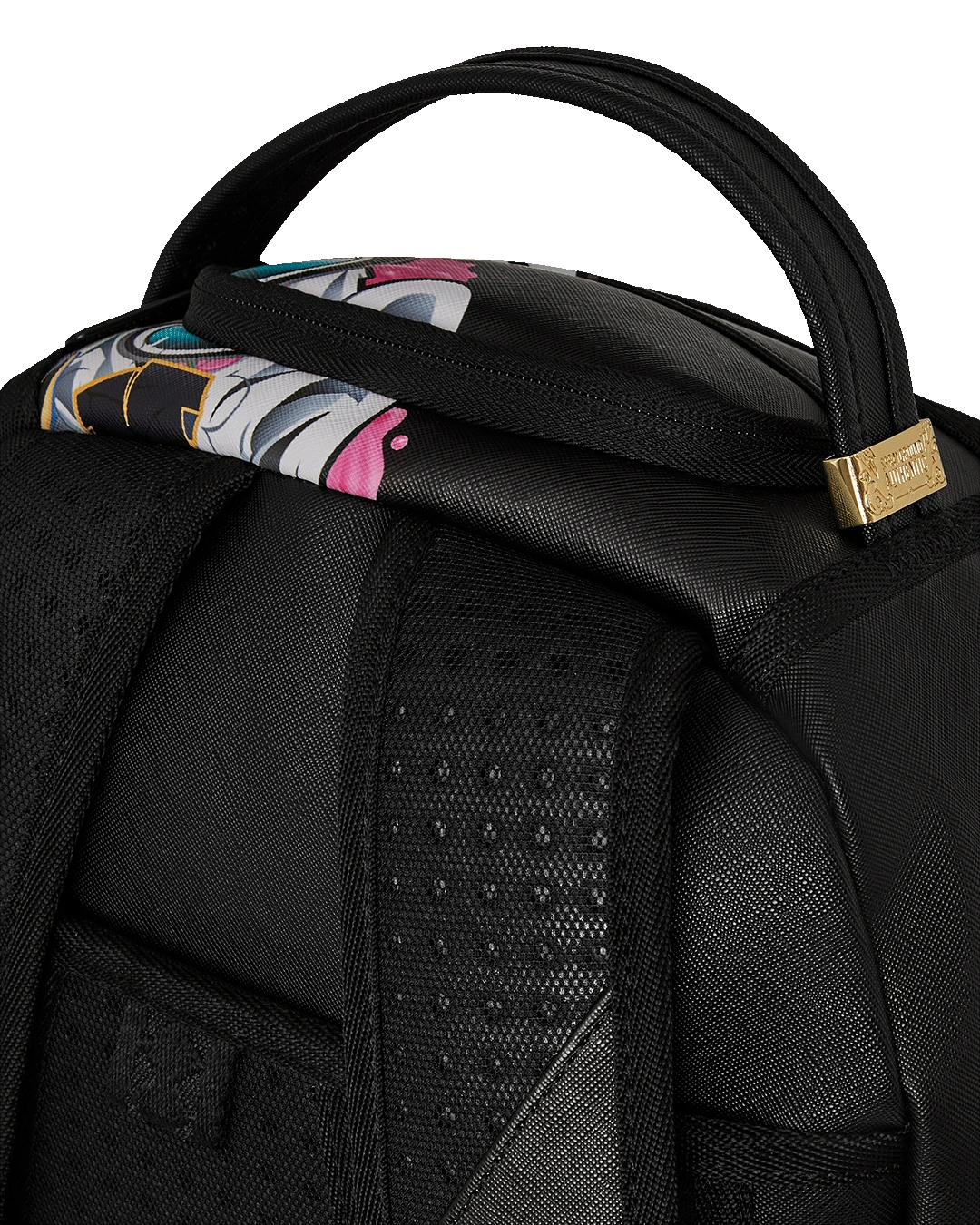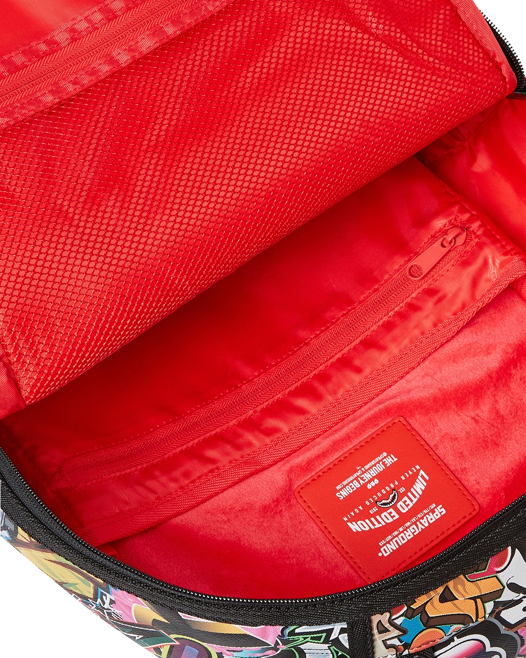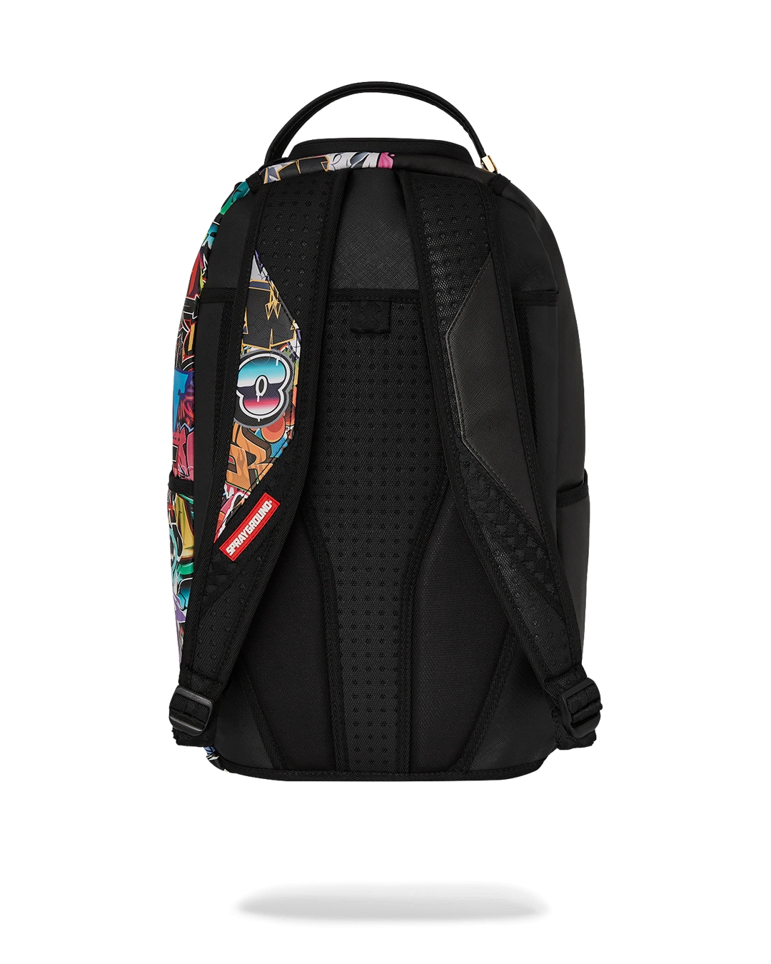 Unique Half Graff Design: This backpack showcases a striking graffiti-inspired graphic featuring bold colors and playful elements, making it a statement piece that stands out in any crowd.