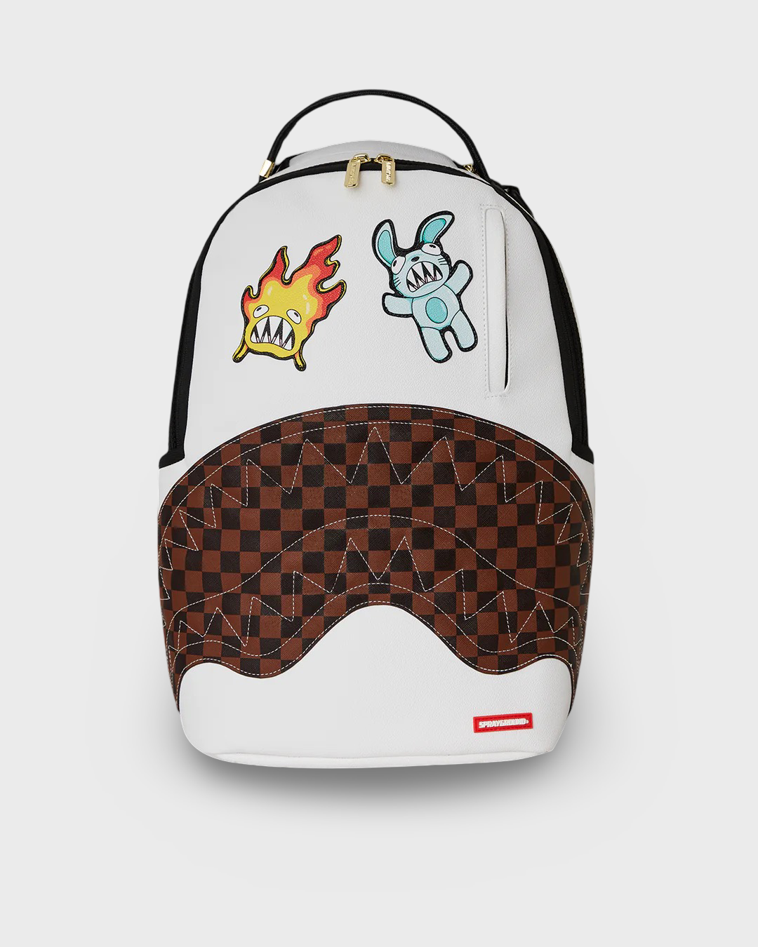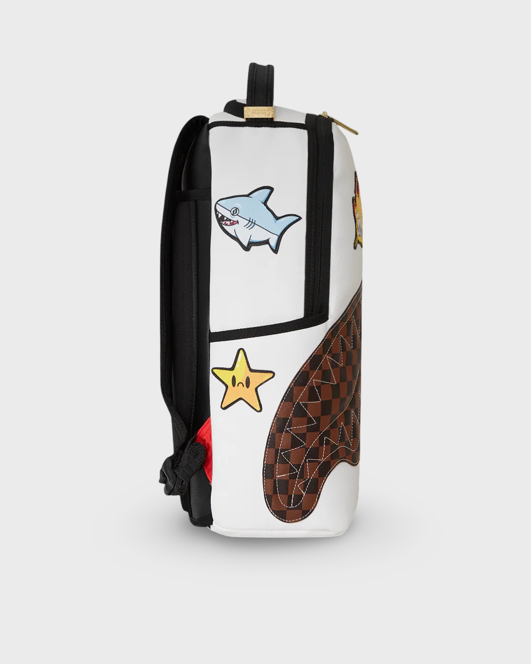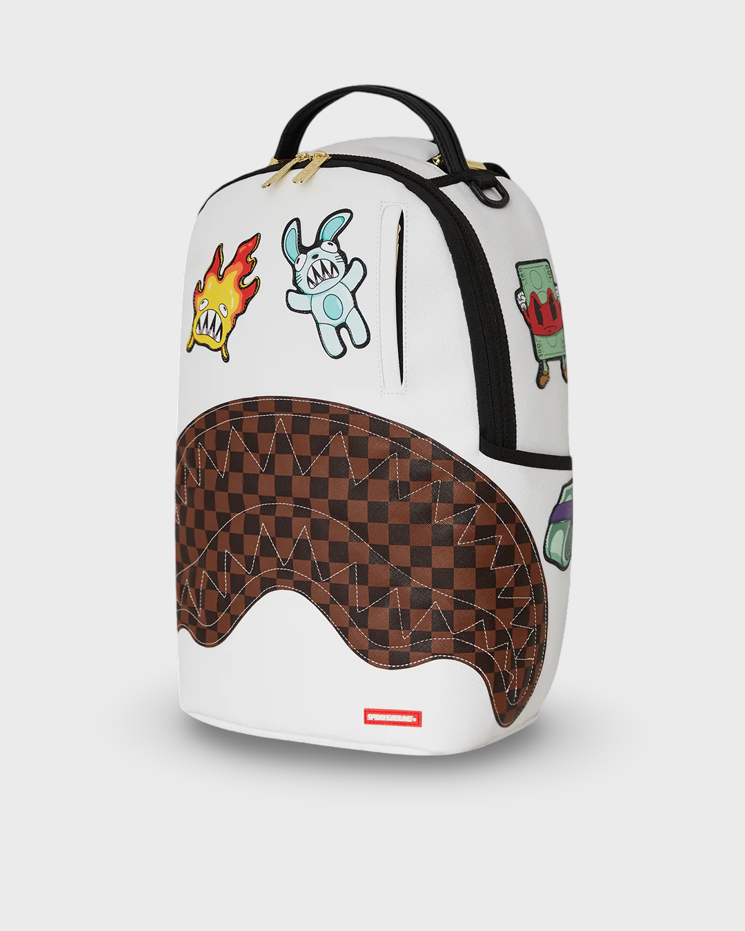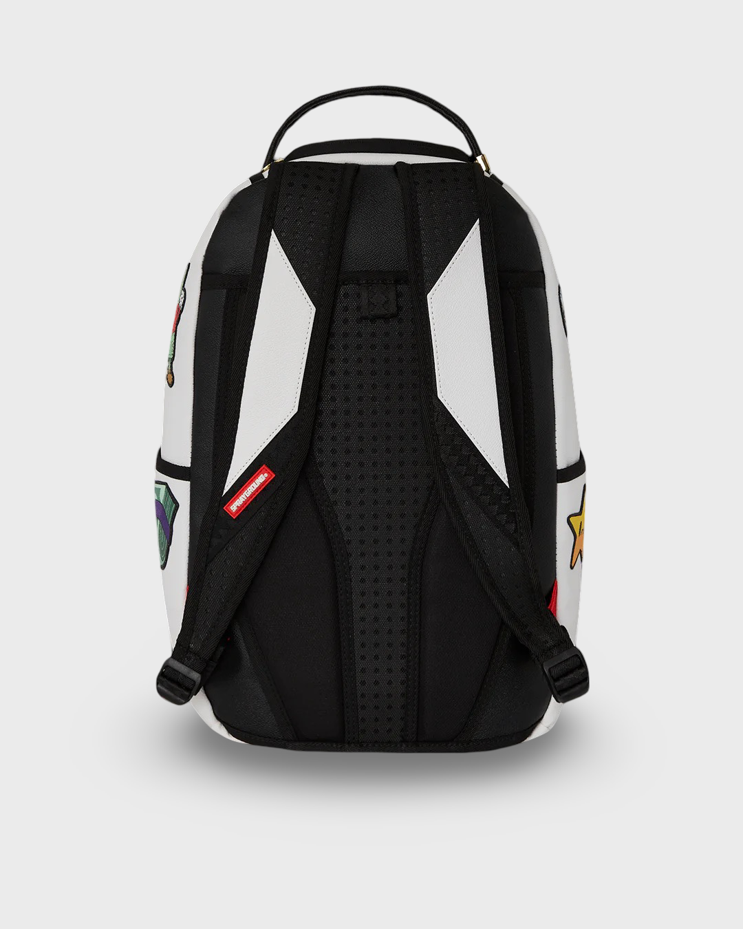 Dimensions: 18" x 6" x 11.5" • Front zipper pocket • Side pockets • Zippered Stash pocket • Separate velour sunglass compartment • Ergonomic mesh back padding • Adjustable Straps for custom sizing • Gold zippers with metal hardware • Metal "Sprayground Authentic" badge • Slide through back sleeve connects to carry-on luggage to free your hands