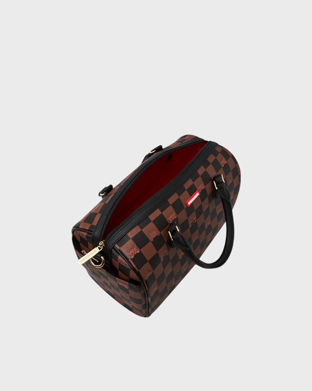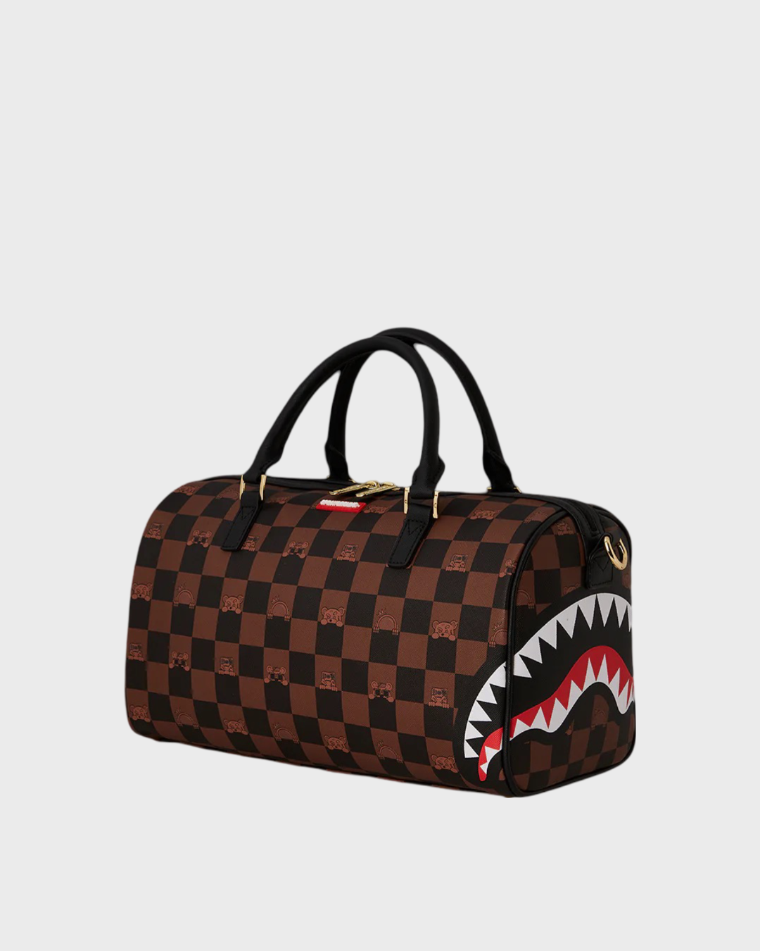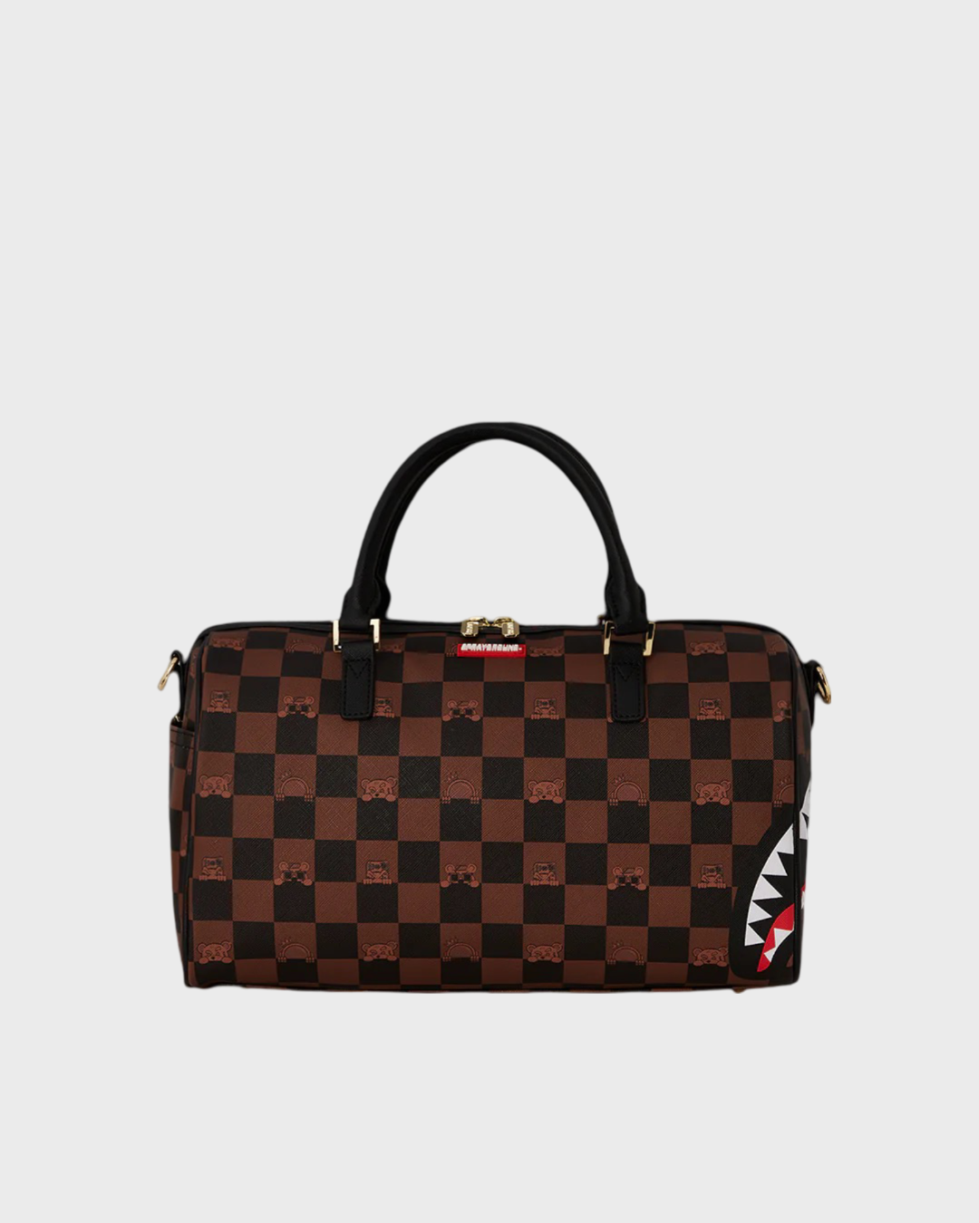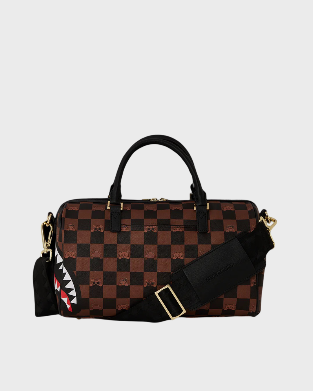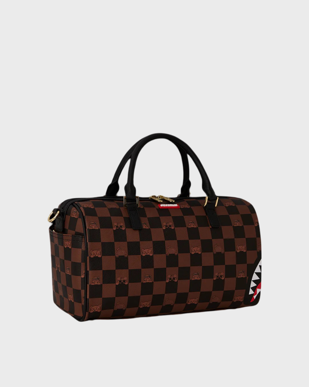 The Peeking Character Check Mini Duffle from Sprayground is a stylish and functional accessory crafted from durable, vegan leather. It offers a compact yet practical design, ideal for travel or daily use. The bag features a zippered main compartment and a sneaker pocket, adding versatility to its design. With adjustable straps for a customized fit, it ensures comfort while carrying. Gold zippers and metal hardware enhance its premium look, making it a standout piece. The dimensions are approximately 8" x 7.5" x 13". This mini duffle is not only functional but also a statement piece for fashion-forward individuals