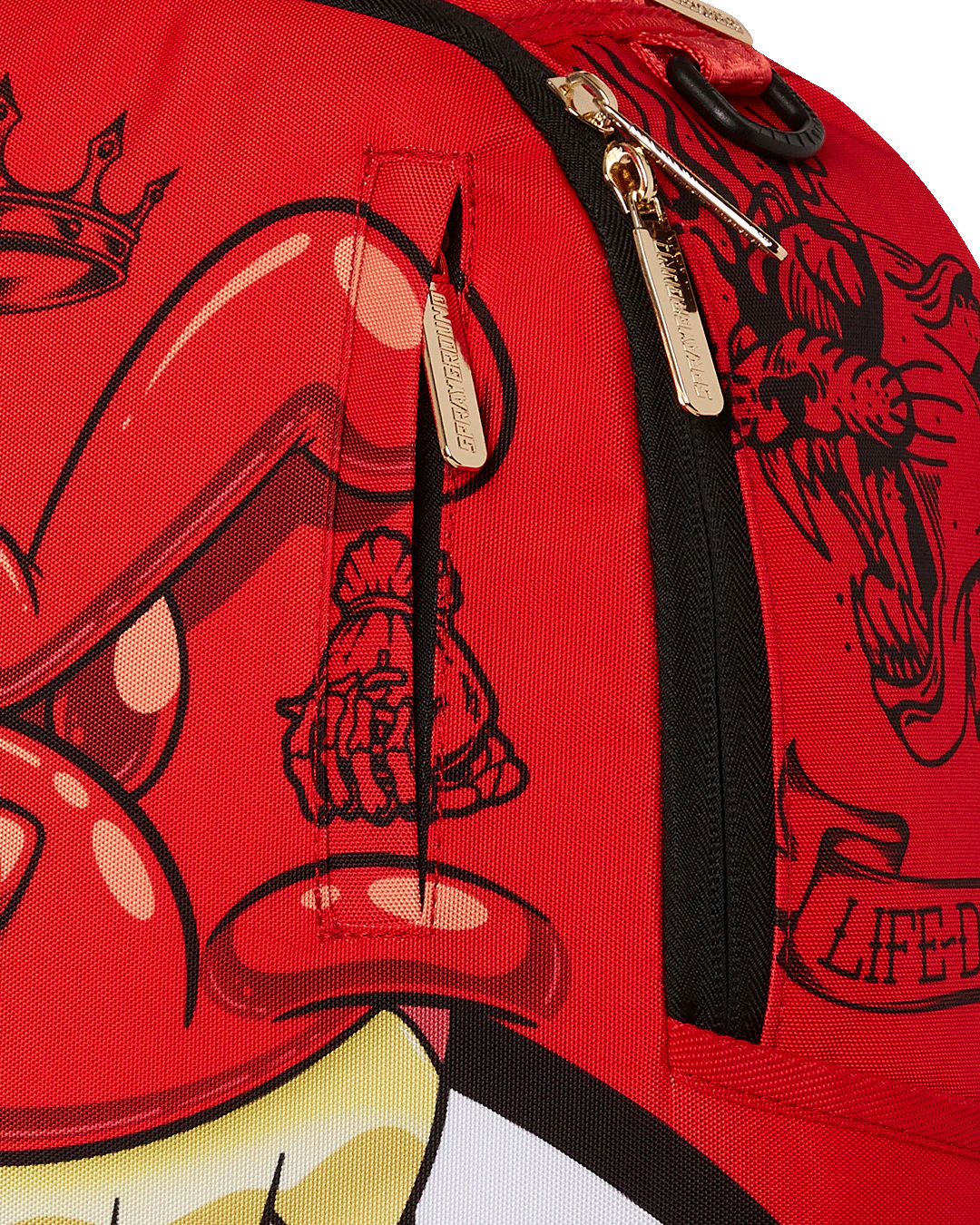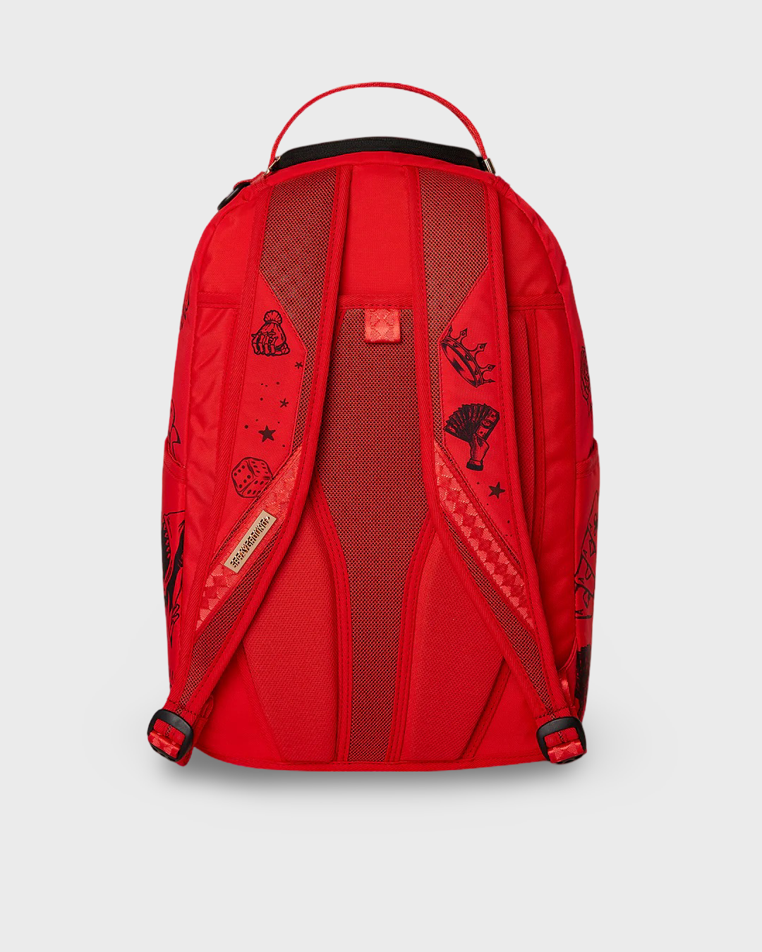 Dimensions: 18" x 6" x 11.5" • Front zipper pocket • Side pockets • Zippered Stash pocket • Separate velour sunglass compartment • Ergonomic mesh back padding • Adjustable Straps for custom sizing • Gold zippers with metal hardware • Metal "Sprayground Authentic" badge • Slide through back sleeve connects to carry-on luggage to free your hands