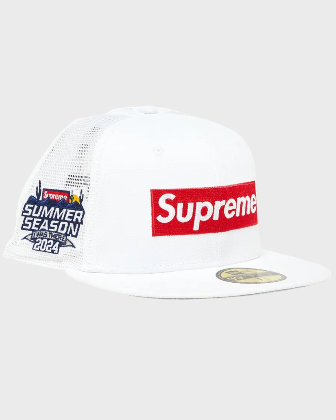 The Supreme Box Logo Mesh Back New Era Cap from the Spring/Summer 2024 collection was released on April 4, 2024. It features a poly New Era® 59FIFTY baseball hat design with a mesh back and embroidered logos on the front, sides, and back.