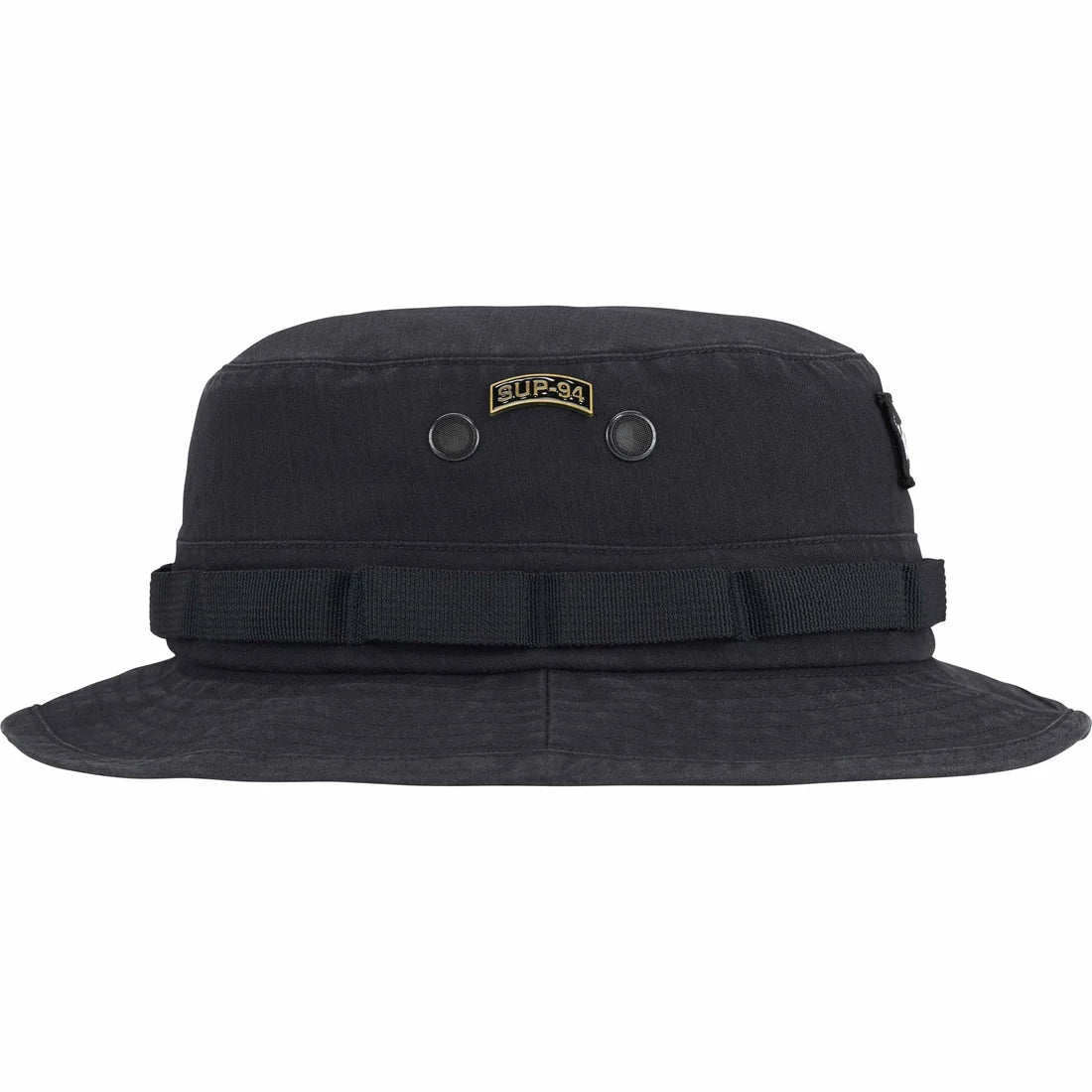 All cotton boonie with cotton cord closure and leather cord stopper. Woven logo label at front. Enamel pin included.
