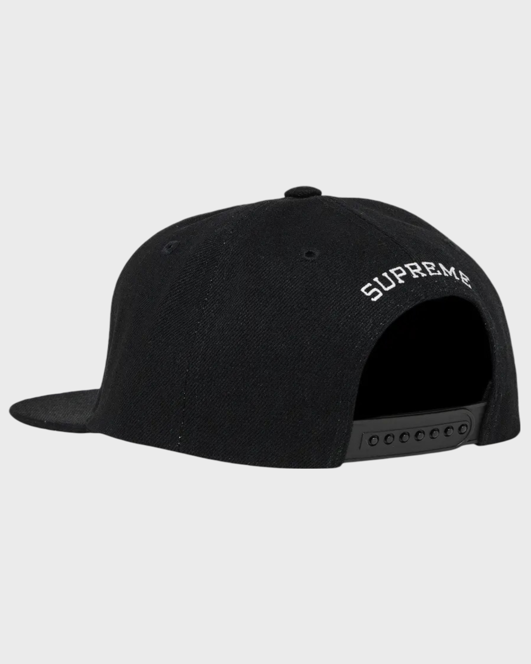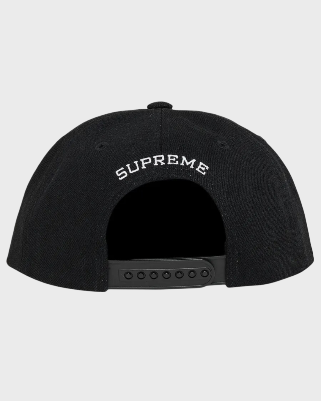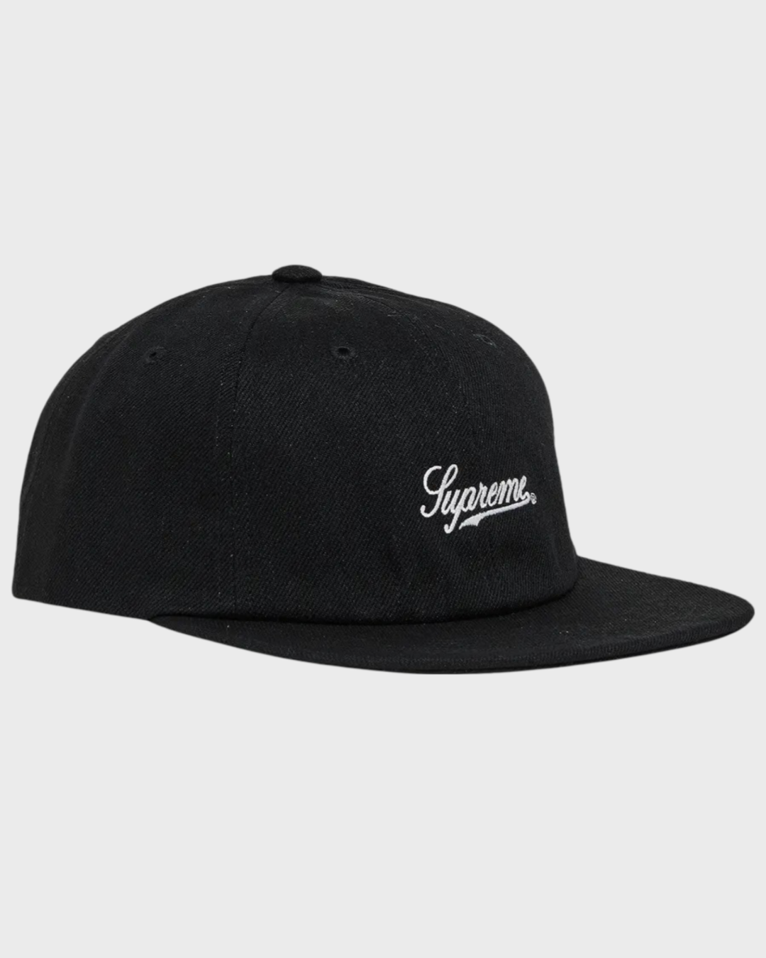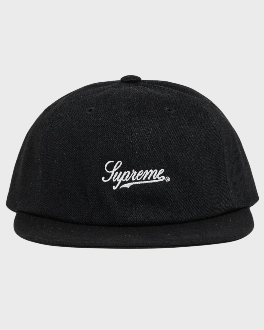 The Supreme Script Logo 6-Panel Black hat was released on April 25, 2024, as part of the Spring/Summer 2024 collection. It features an all-cotton construction with a snap closure and embroidered logos on both the front and back.