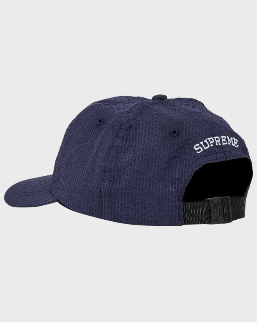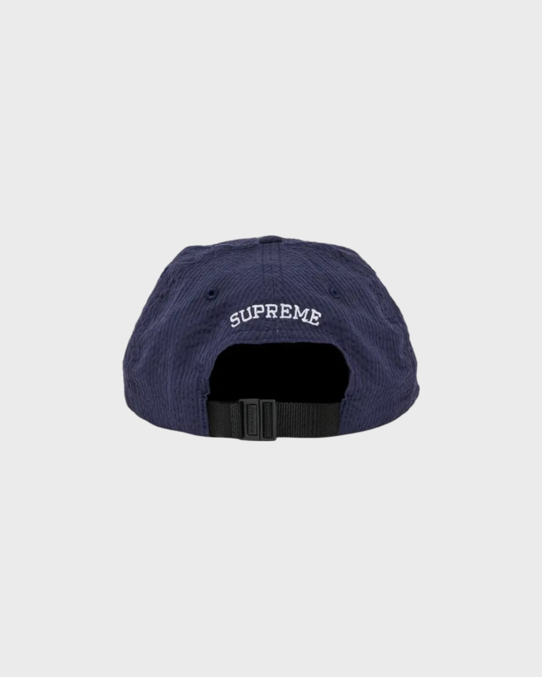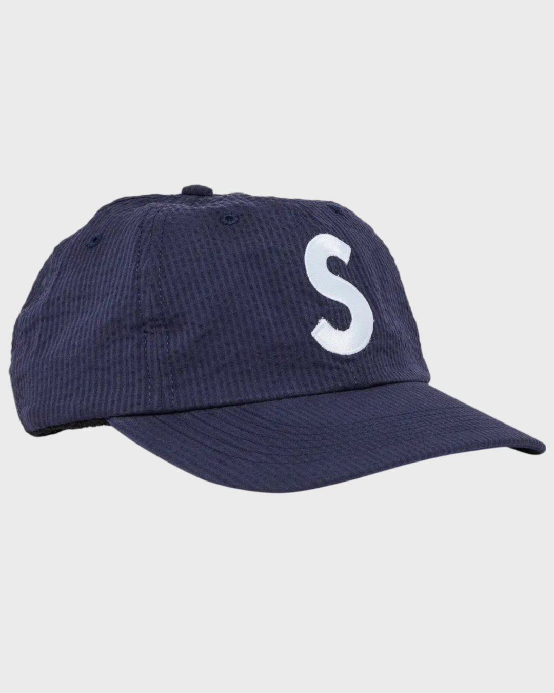 The Supreme Seersucker S Logo 6-Panel Hat from the SS24 collection,This hat features a seersucker fabric design with Supreme’s signature "S" logo on the front.