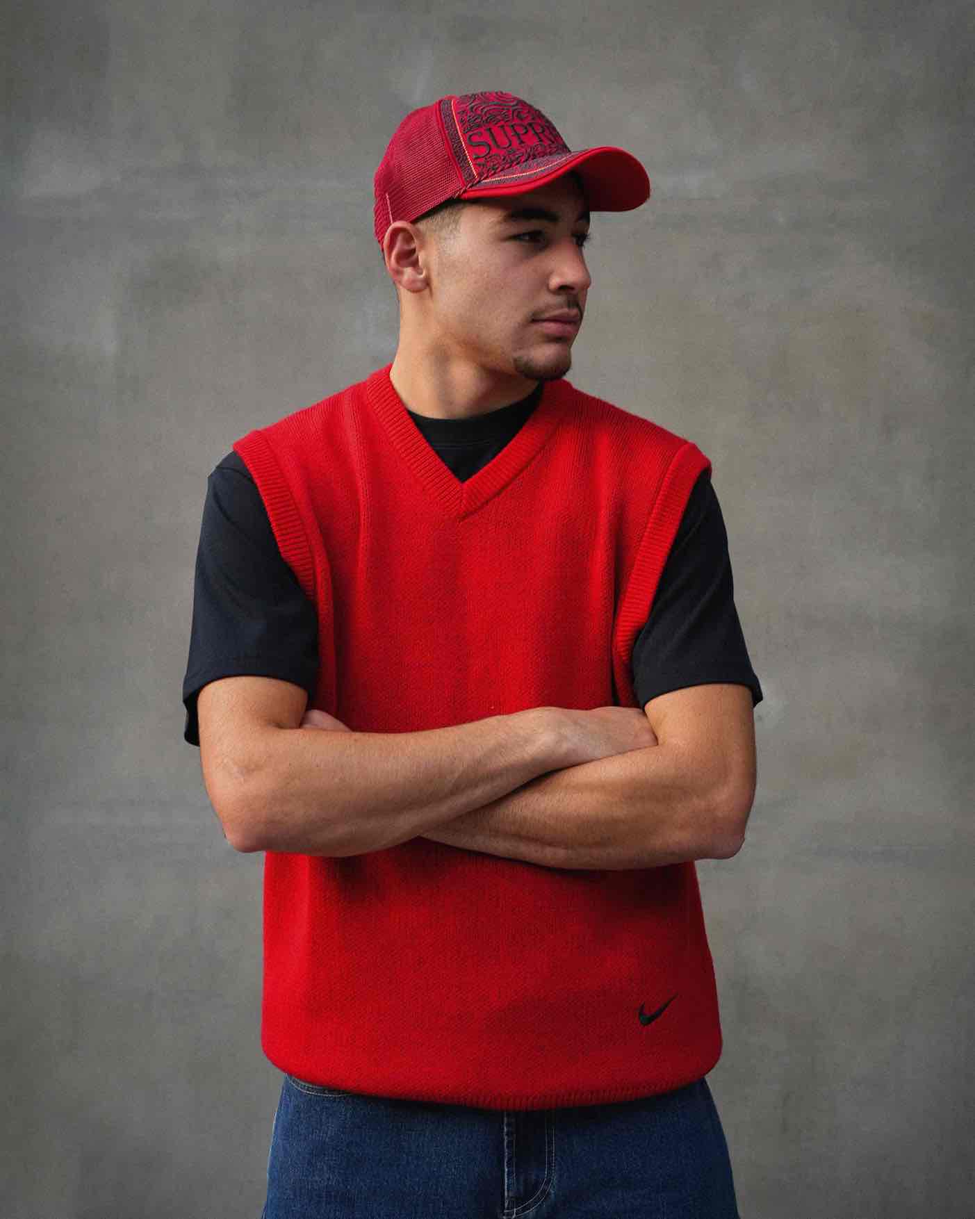 Merino wool blend with embroidered logo at lower front and jacquard knit logo at back. Made exclusively for Supreme.