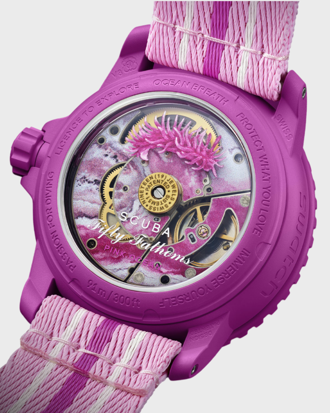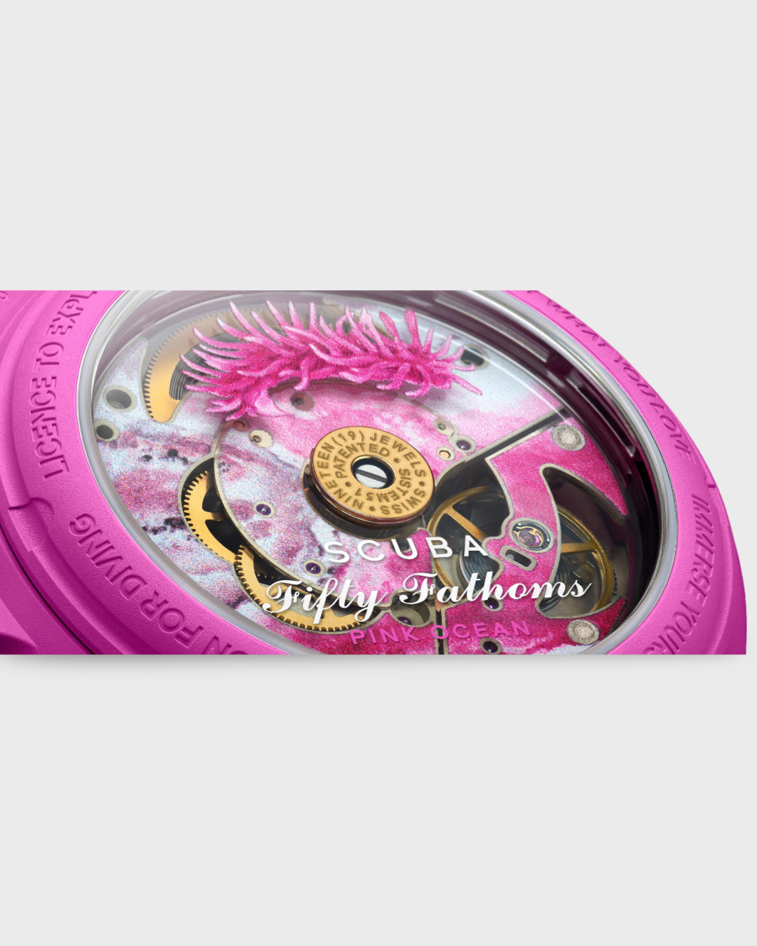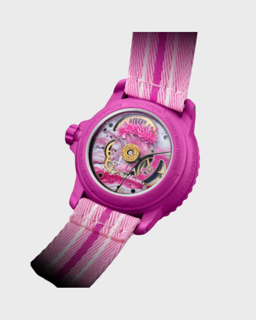 Blancpain X Swatch watch honors Blancpain’s Fifty Fathoms, the first true diver’s watch. Its pink case and crown are made of Bioceramic material. The word “Swatch” is inscribed on the outer left side of the case. The dial has a sun-brushed finish and features a date indicator between 4 and 5 o'clock. The hour indexes, hour, and minute hands, the tip of the seconds hand as well as the scale on the bezel, are enriched with Grade A Super-LumiNova® for outstanding legibility in the dark. The watch features a pink unidirectional Bioceramic bezel and biosourced glass. The SISTEM51 mechanical movement is visible through a transparent sapphire glass caseback and features a digital print of pink-hued water and the Ceratodoris rosacea nudibranch in digital print. Five inspirational inscriptions can be found on the back of the watch