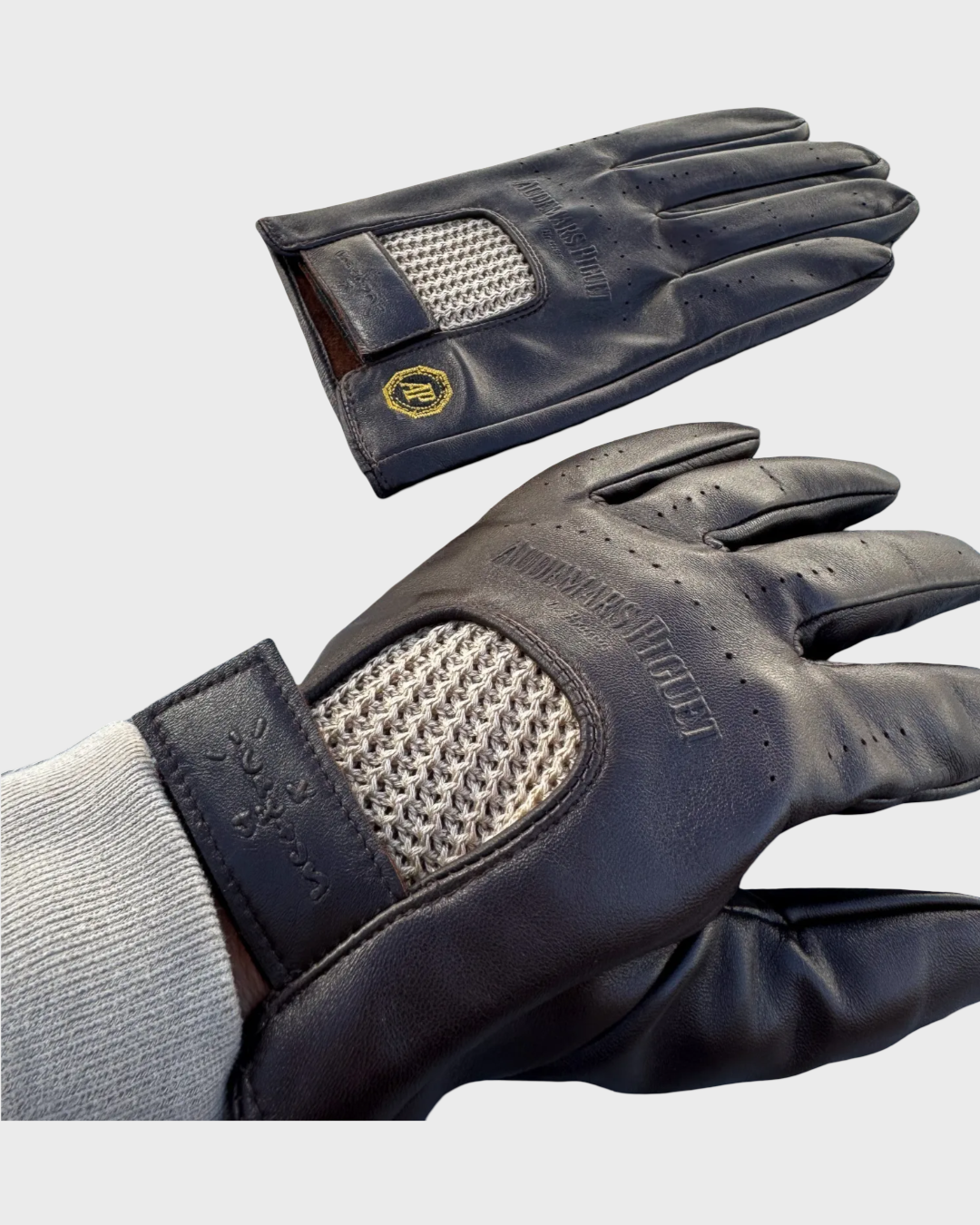 Heritage meets street – These gloves echo the brown ceramic + textured leather strap combo of the Royal Oak, merging AP’s craft with Travis Scott’s aesthetic