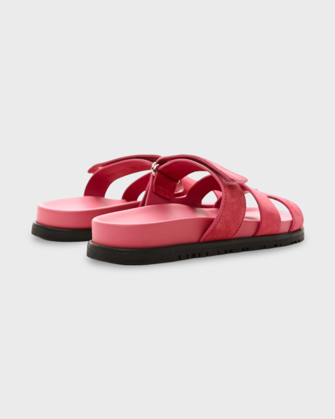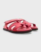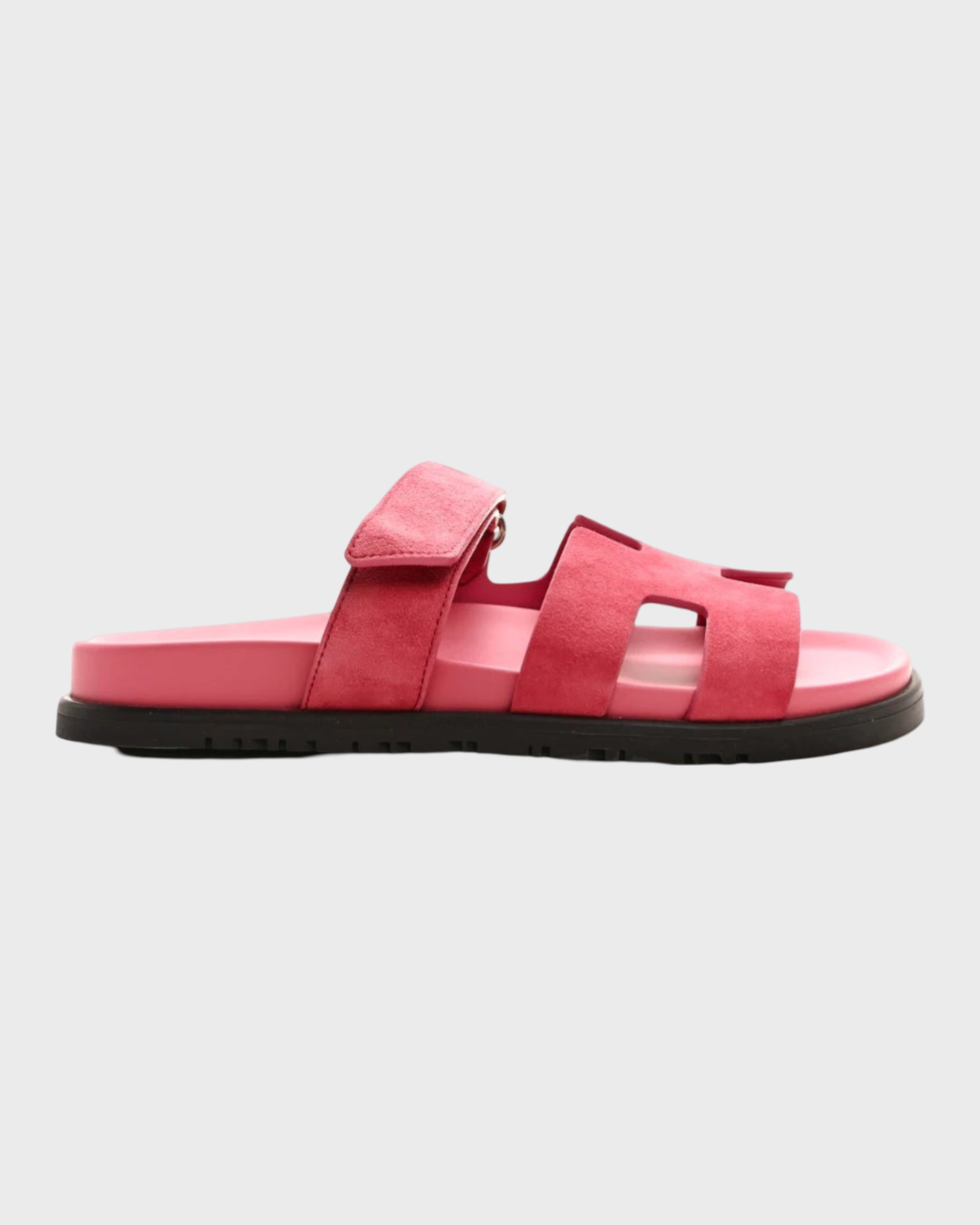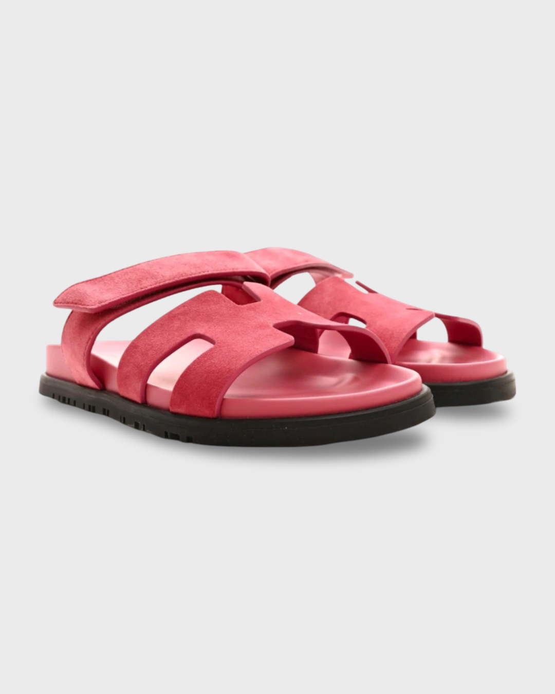 ermès Chypre Femme sandals in Chèvre Velours Rose Vermillion. Crafted from premium goatskin suede, these iconic slip-ons offer both elegance and comfort. The bold Rose Vermillion hue adds a vibrant touch, making them a statement piece for any wardrobe. Featuring an anatomically designed sole for ultimate ease, these sandals blend casual sophistication with Hermès’ signature craftsmanship.