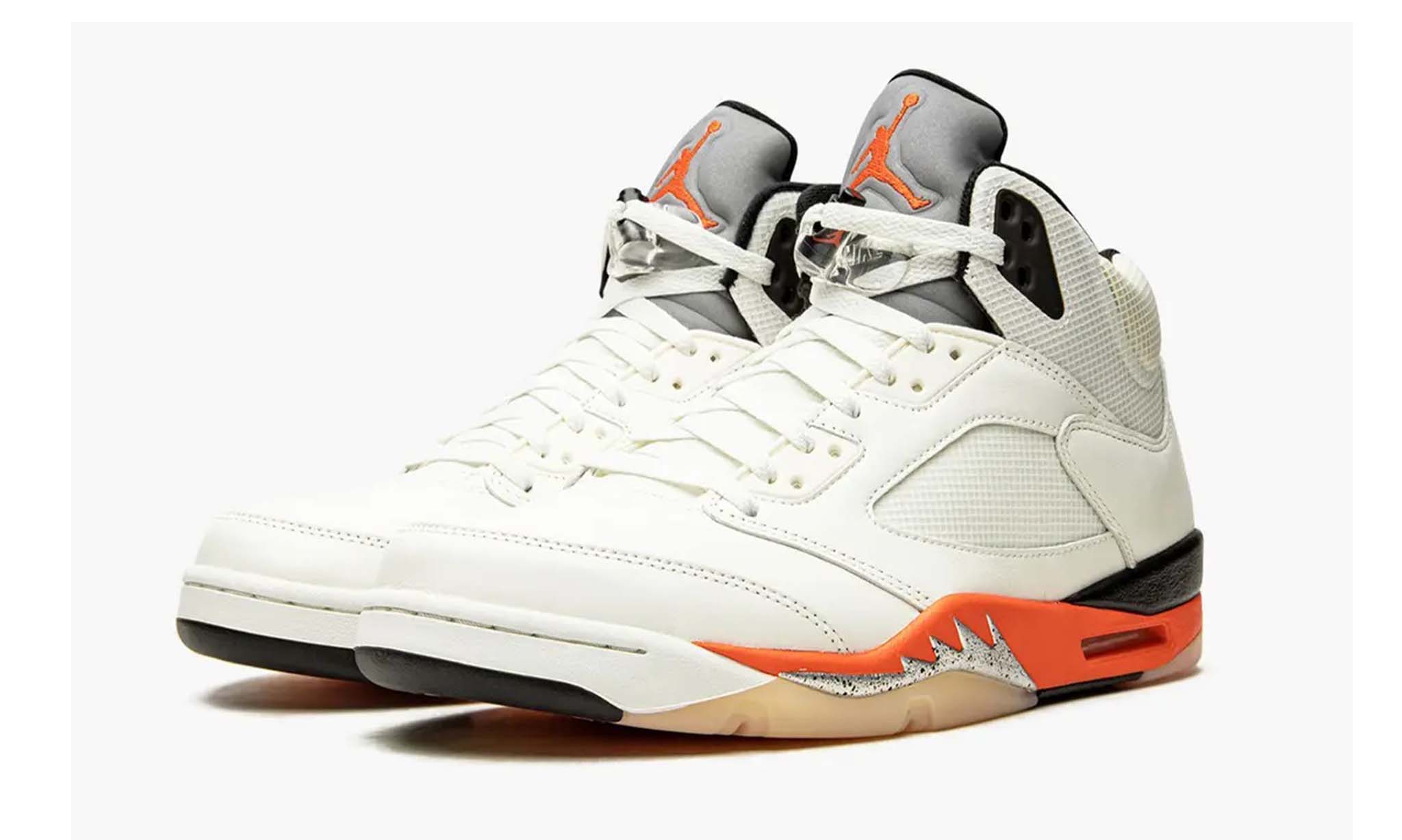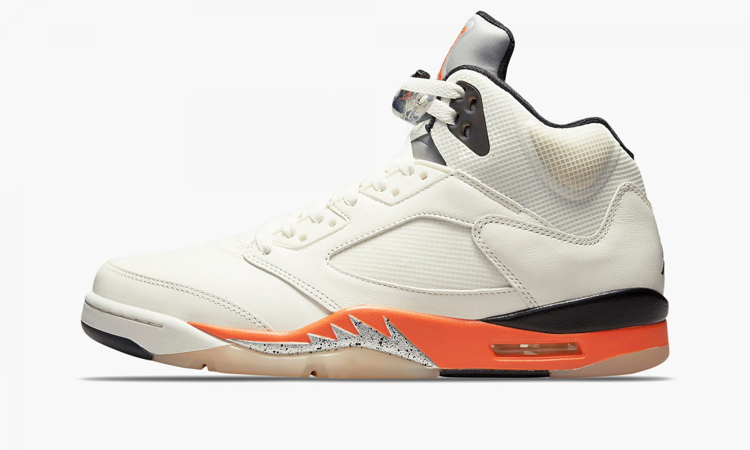 The Air Jordan 5 “Shattered Backboard” or “Orange Blaze” updates Michael Jordan’s fifth signature shoe in a colorway first seen on the Air Jordan 1 back in 2015. The “Shattered Backboard” theme is inspired by team uniforms worn by Jordan during an oversea exhibition game in Italy in 1985 when he famously shattered a glass backboard following a powerful dunk. The Jordan 5’s version of the “Shattered Backboard” makes use of the same white, black, and orange color scheme as every “Shattered Backboard” Air Jordan before it, albeit in a unique way. Sail leather appears on the upper while the collar, quarter panel, and lower tongue are constructed in a fine mesh material that appears on the Jordan 5 for the first time on this colorway. The top of the tongue, which displays an Orange Blaze Jumpman, is treated to the same reflective silver finish as the Jordan 5’s original construction. A black Jumpman is stitched onto the heel. Silver shark tooth detailing is found on the orange painted midsole. Release date: October 2, 2021