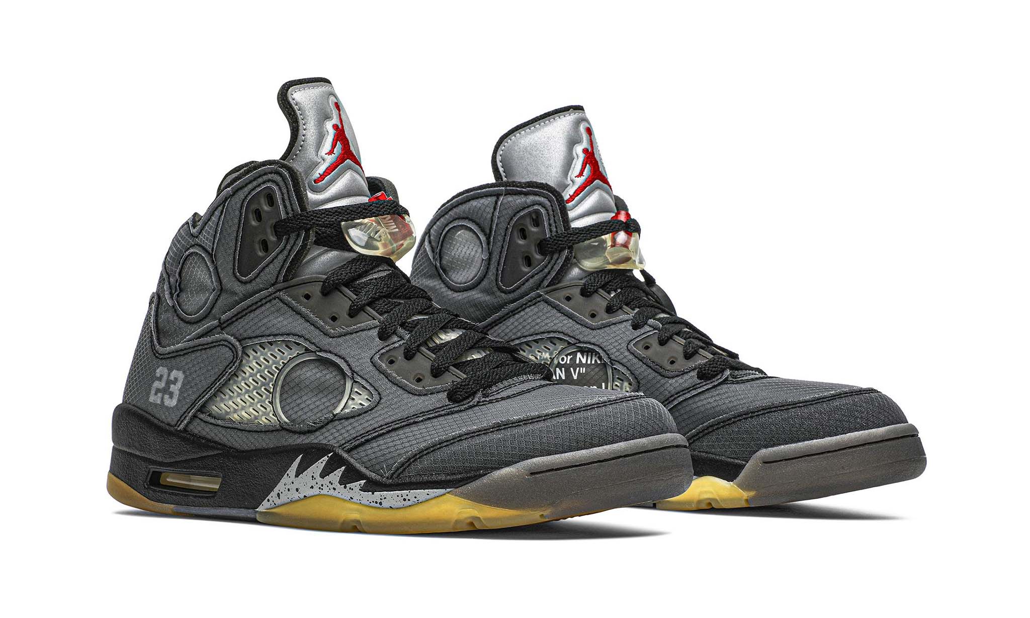 The Off-White x Air Jordan 5 is Virgil Abloh’s rendition of Michael Jordan’s fifth signature shoe that incorporates the former’s deconstructed design ethos. The NBA All-Star Weekend 2020 release omits the Jordan 5’s traditional leather construction for a light grey synthetic, semi-translucent material. Circular designs with Abloh’s signature Nike branding motif can be found on the inside of each shoe over the midfoot netting. For the first time ever on a non-original Air Jordan 5 colorway, embroidered Nike Air branding appears on the heel. White “23” detailing covers the heel near the midsole and a fiery red Jumpman covers the 3M-reflective tongue. A pre-yellowed outsole gives the Off-White Jordan 5 the already-worn-in vibe that Abloh often prefers to include on his collaborations with both Nike and Jordan Brand. Release date: February 2020.