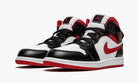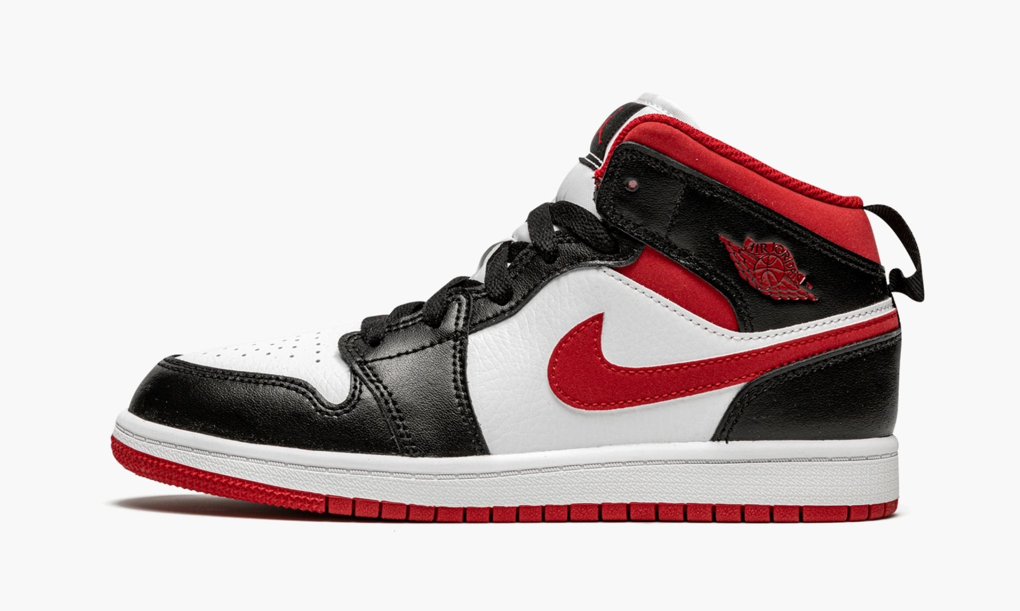 The Air Jordan 1 Mid PS “Black/Gym Red” is the preschool sizing of Michael Jordan’s first signature shoe in a Chicago Bulls inspired makeup. The Bulls’ team uniform colors, black, white, and red, have appeared on countless legendary Air Jordans and add a retro inspired look to the design of the “Black/Gym Red” edition seen here. The perforated toe and mid-panel feature a white leather construction. Black leather can be found on the forefoot, eyelets, collar, and heel. A matte Metallic Red material adorns the Swoosh and ankle panels, while the “Wings” logo also receives a metallic red makeover. A red Jumpman appears on the black nylon tongue tag and black laces are layered over the white nylon tongue.