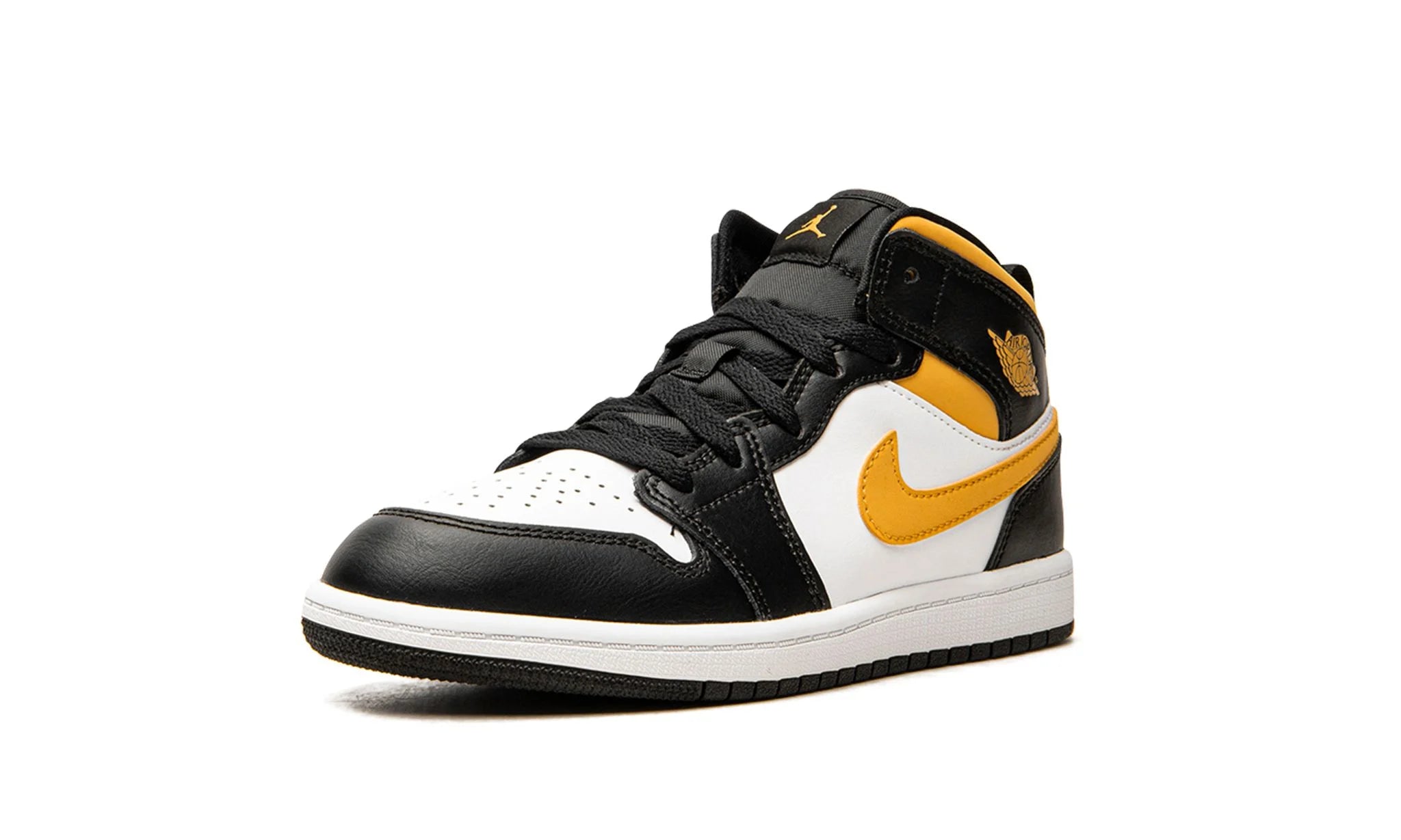 The Jordan 1 Mid PS “White/Pollen/Black” is the preschool version of the mid-top lifestyle shoe in a clean, wearable colorway. The Air Jordan 1 Mid is the alternate version of Michael Jordan’s first signature shoe, and one of Jordan Brand’s most popular shoes. Here, on the “Pollen,” white leather appears on the toe and mid-panel. Contrasting black leather panels and a Pollen-colored Swoosh on either side of the shoe balance out the look of the neutral base. Additional details include a yellow “Wings” logo on the collar and a yellow Swoosh on the tongue, and a pull tab on the heel that assists with easy on/off wearability. A two-tone, white midsole and black rubber outsole brings the look together.