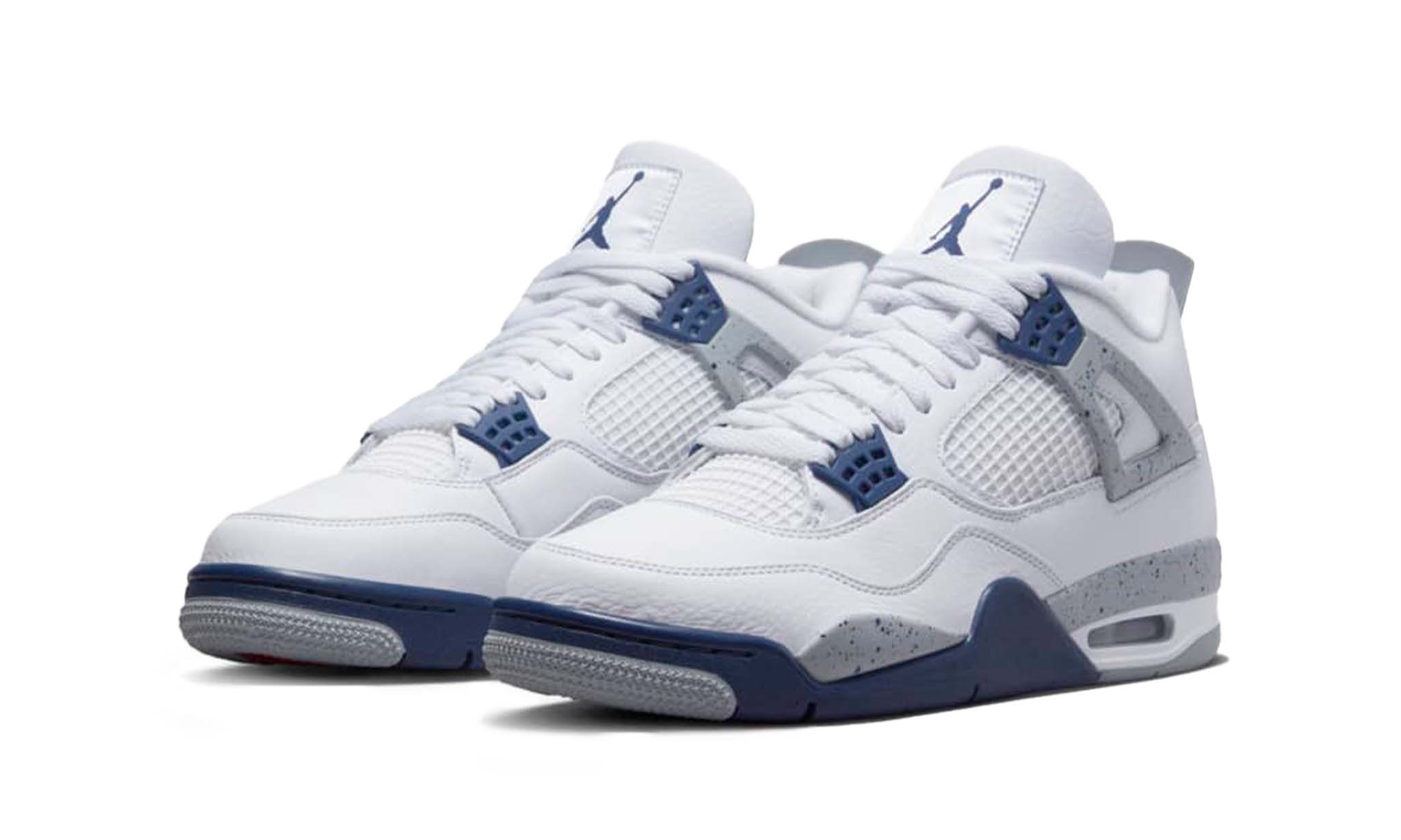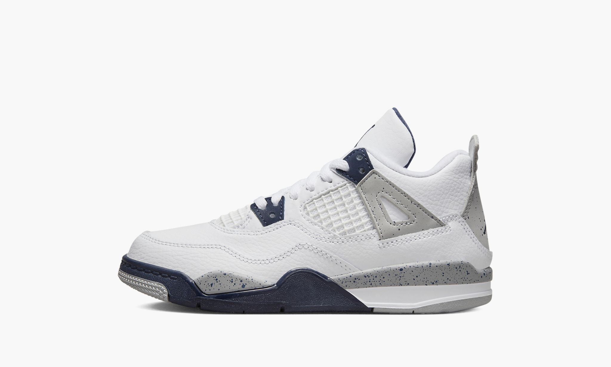 The Air Jordan 4 PS “Midnight Navy” is the preschool sizing of the colorway of retro basketball shoe inspired by the model’s iconic “White Cement” style. The upper is constructed from white leather, save for the tongue and mid-panel which feature tonal mesh detailing. Midnight Navy plastic lace holders are found on the throat and collar. The Jordan 4’s signature “Cement” detailing appears on the “Wings” tabs, on the mudguard, and on the Jumpman branded heel counter. Release date: October 29, 2022
