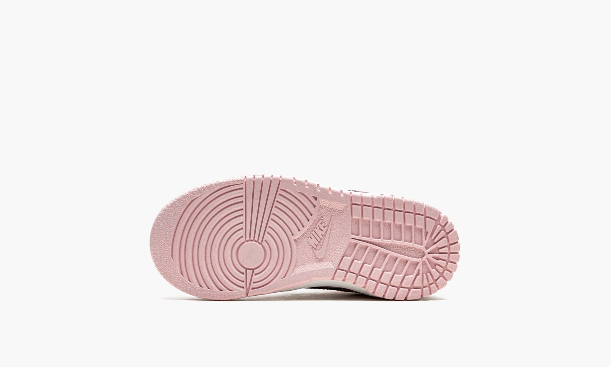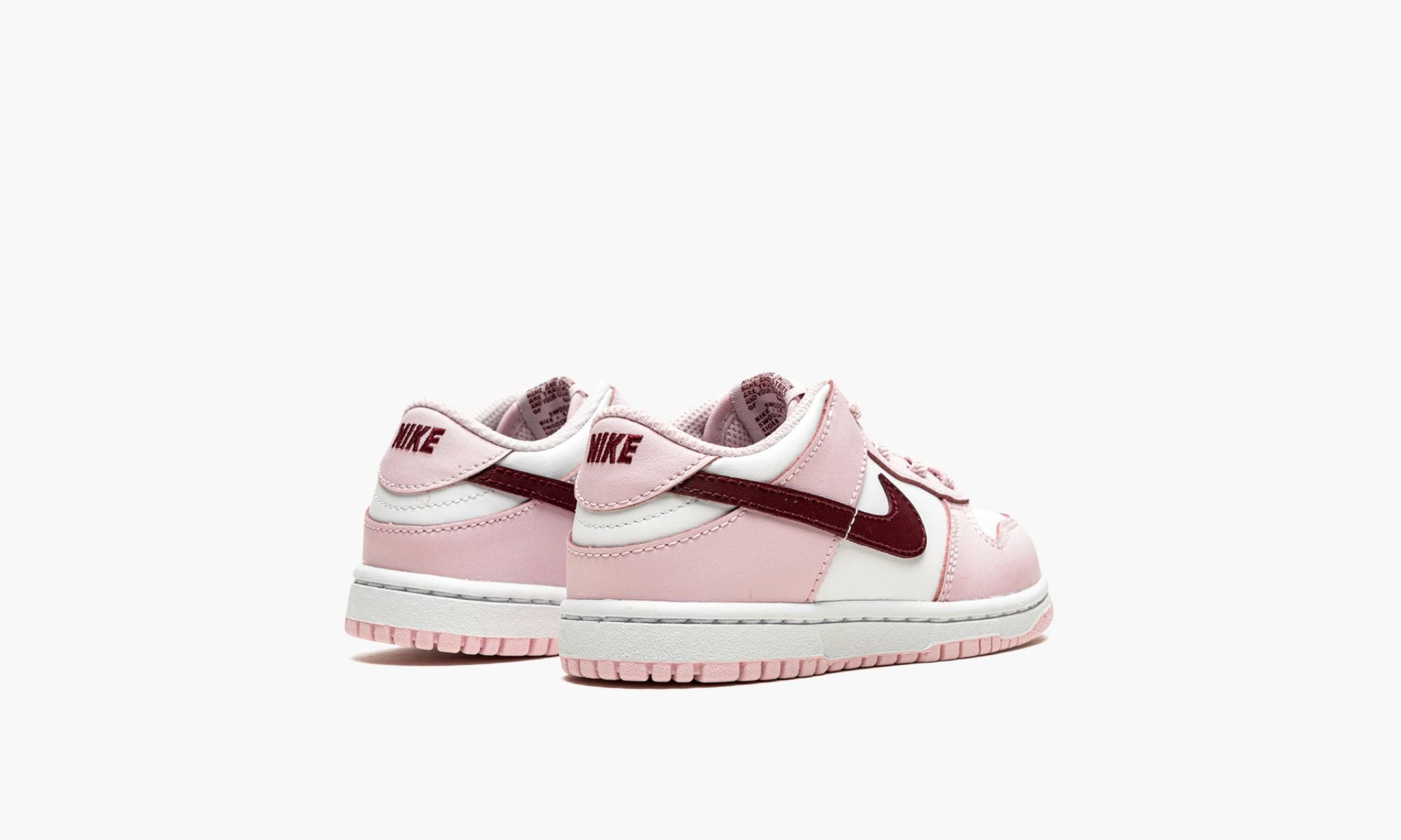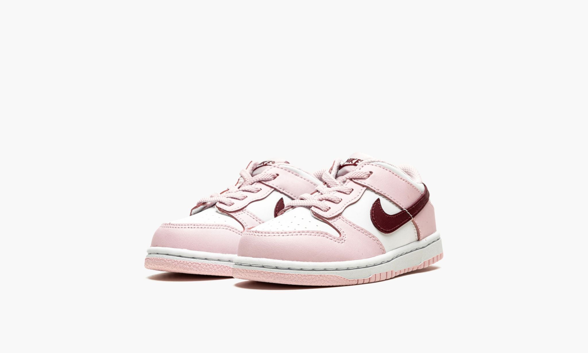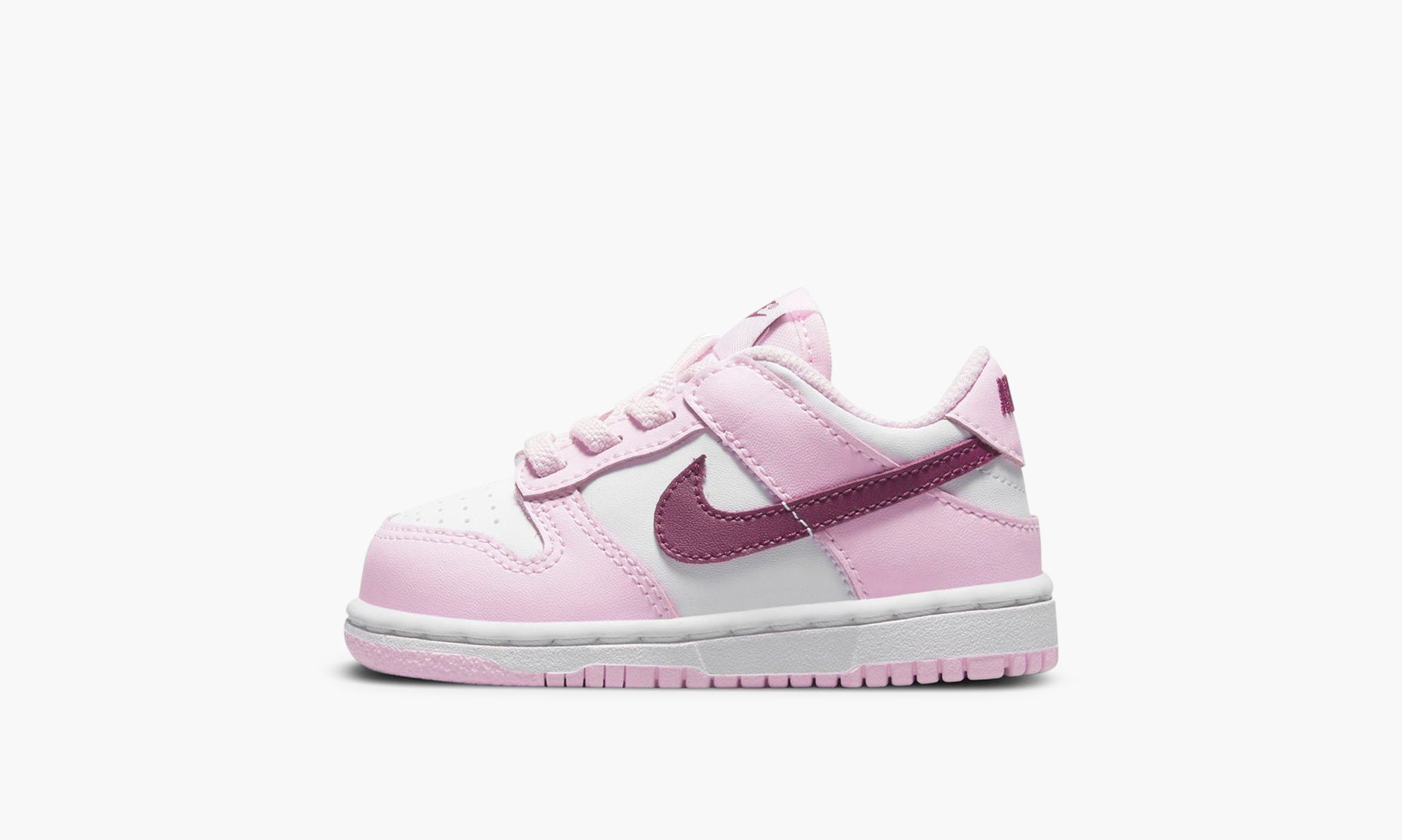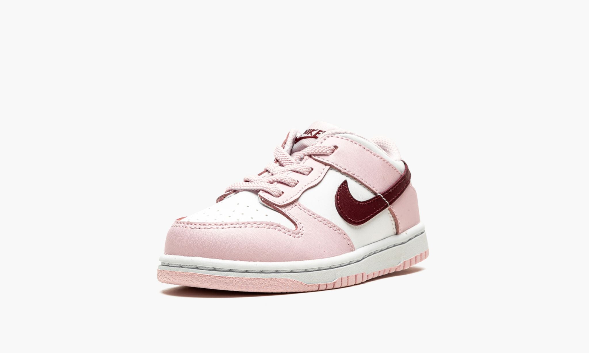 The Nike Dunk Low TD ‘Valentine’s Day’ or Pink Foam showcases a crisp white leather upper with soft pink overlays and a signature Swoosh in dark magenta. Standard Nike branding hits make their way to the heel tab, woven tongue tag and foam insole, which provides lightweight cushioning with each step. The sneaker’s pink rubber outsole features a traction pattern highlighted by concentric circles under the forefoot, originally designed for pivoting on the hardwood while maintaining grip.