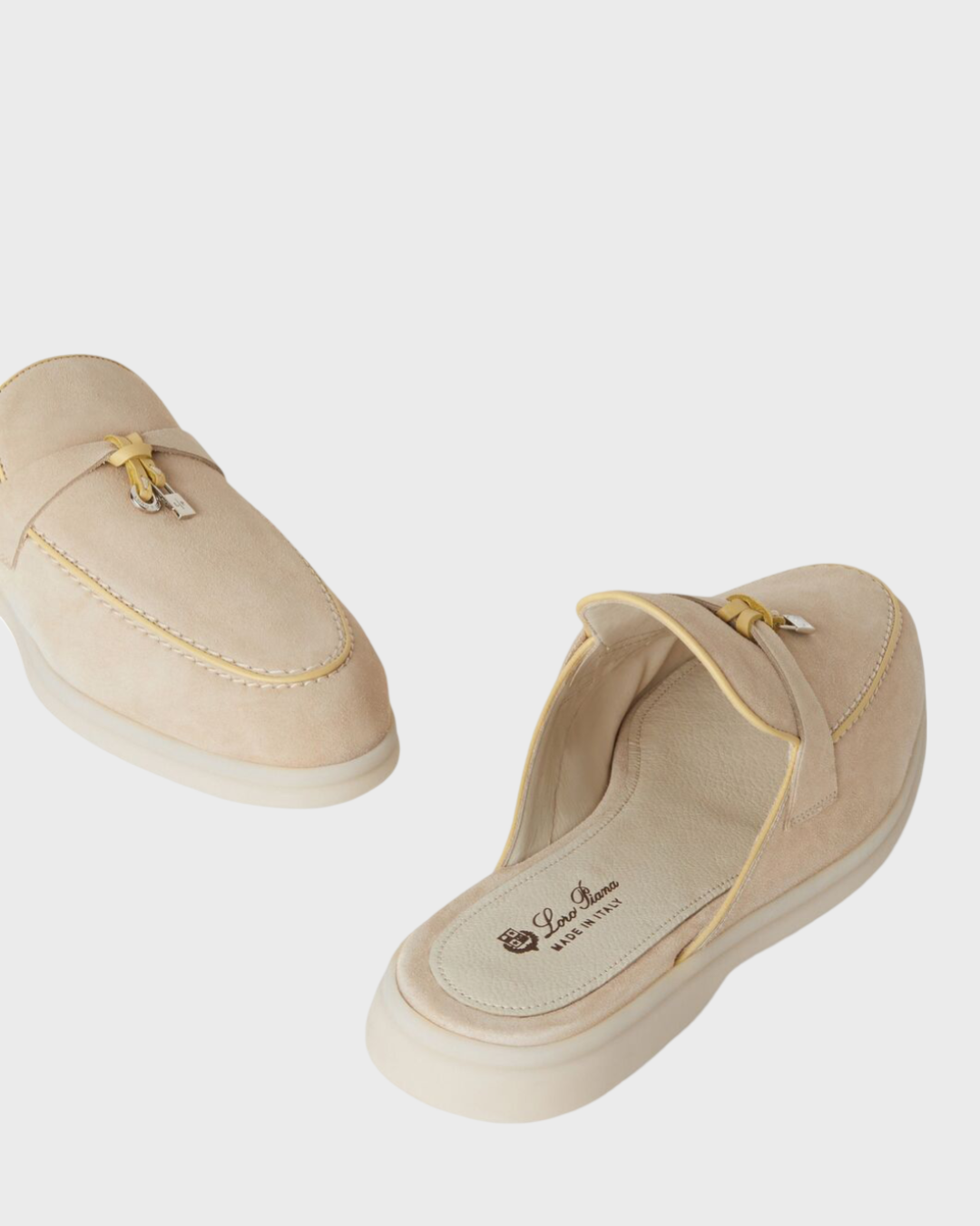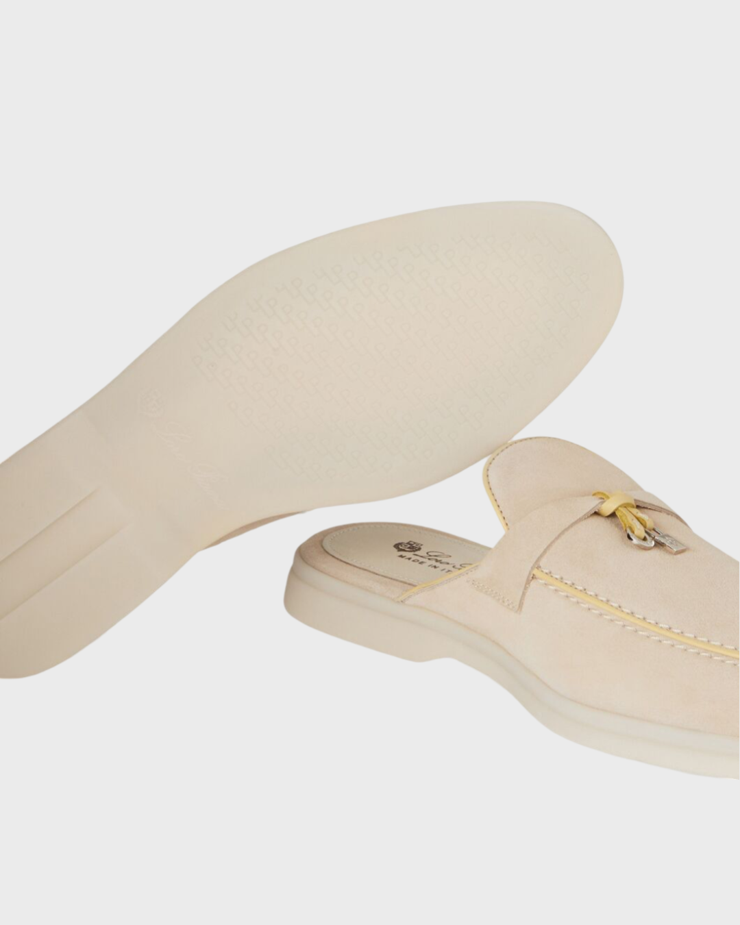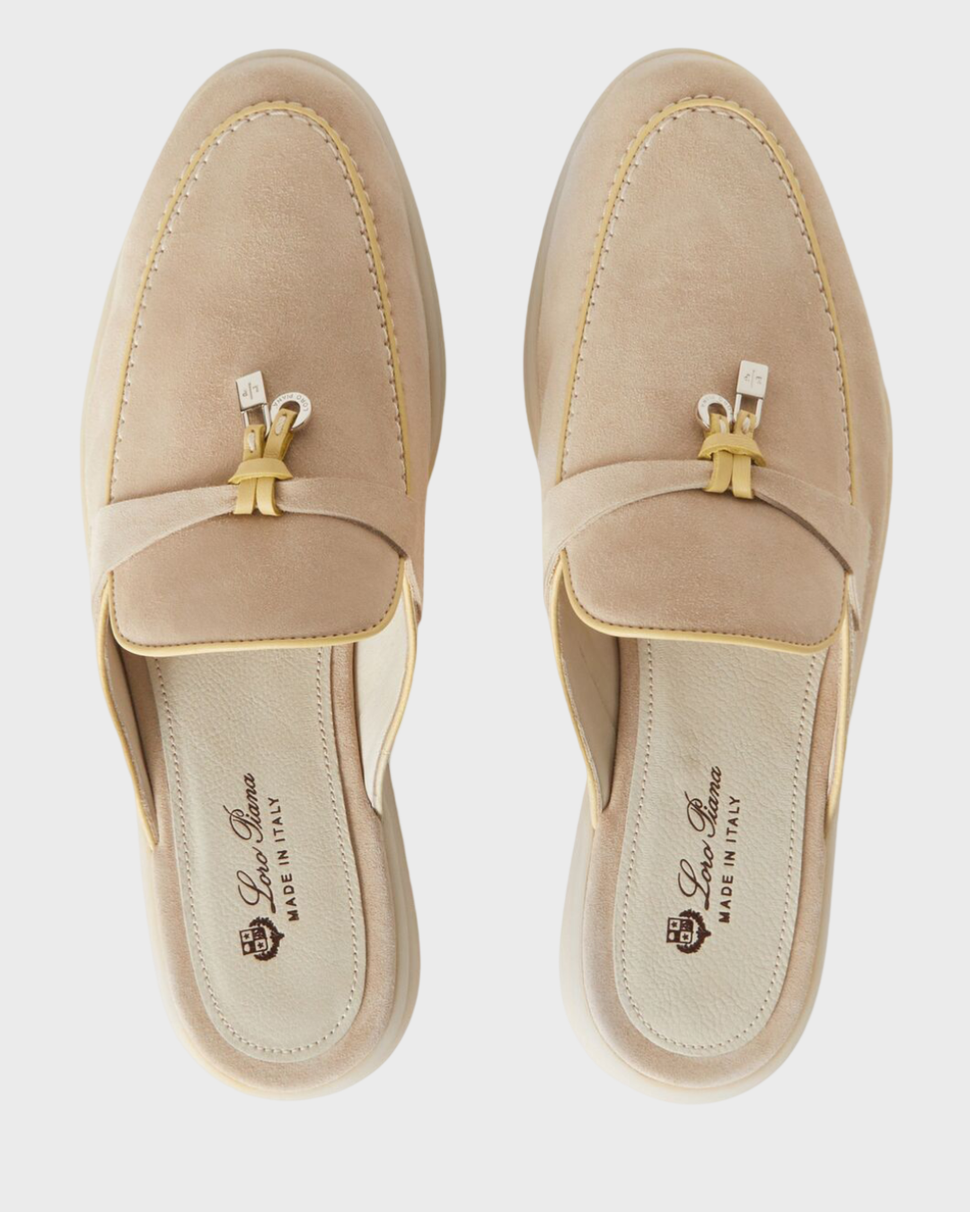 Suede slipper version of the iconic Summer Charms Walk. Nappa leather piping and saddles with Loro Piana My Charms complete the look.