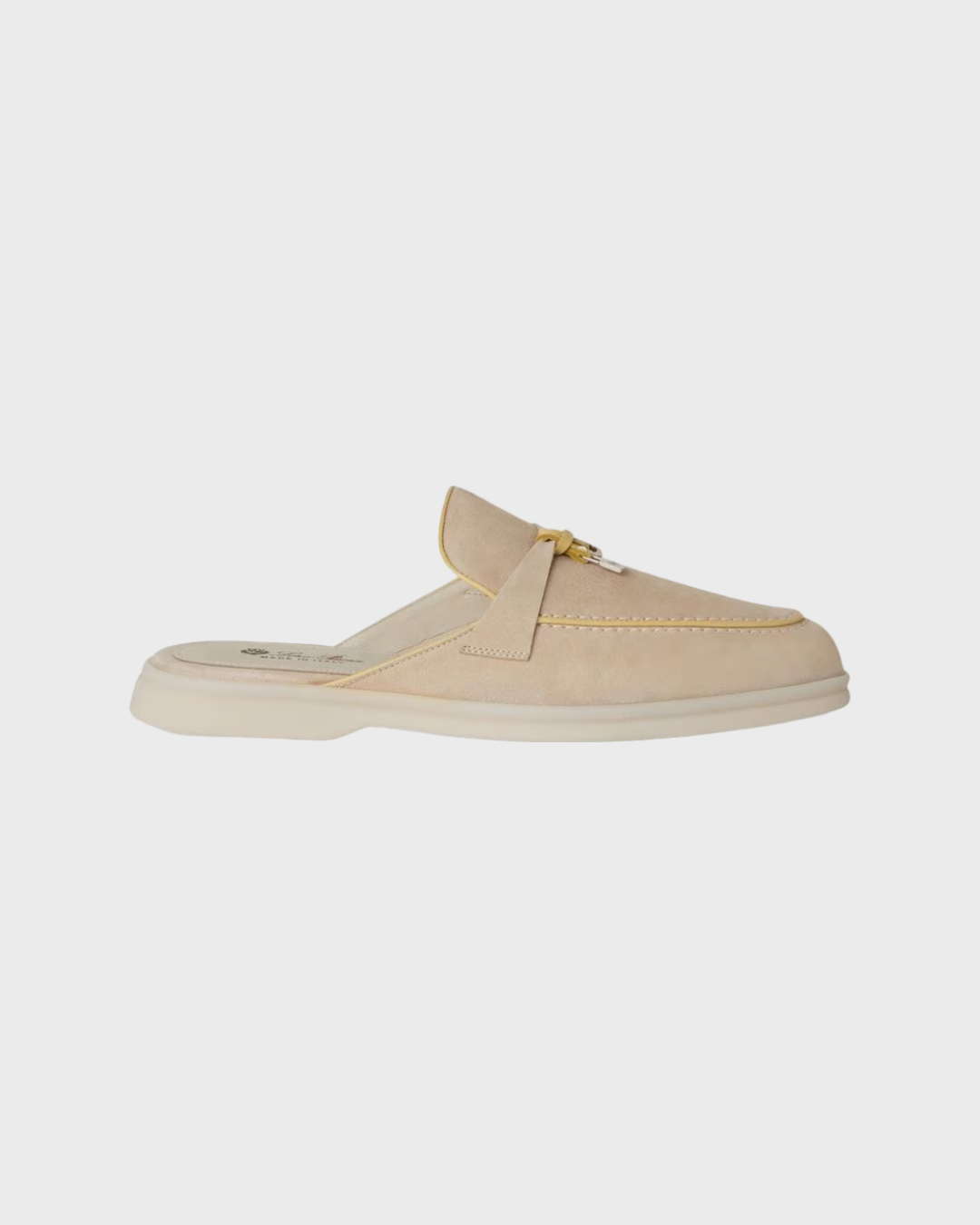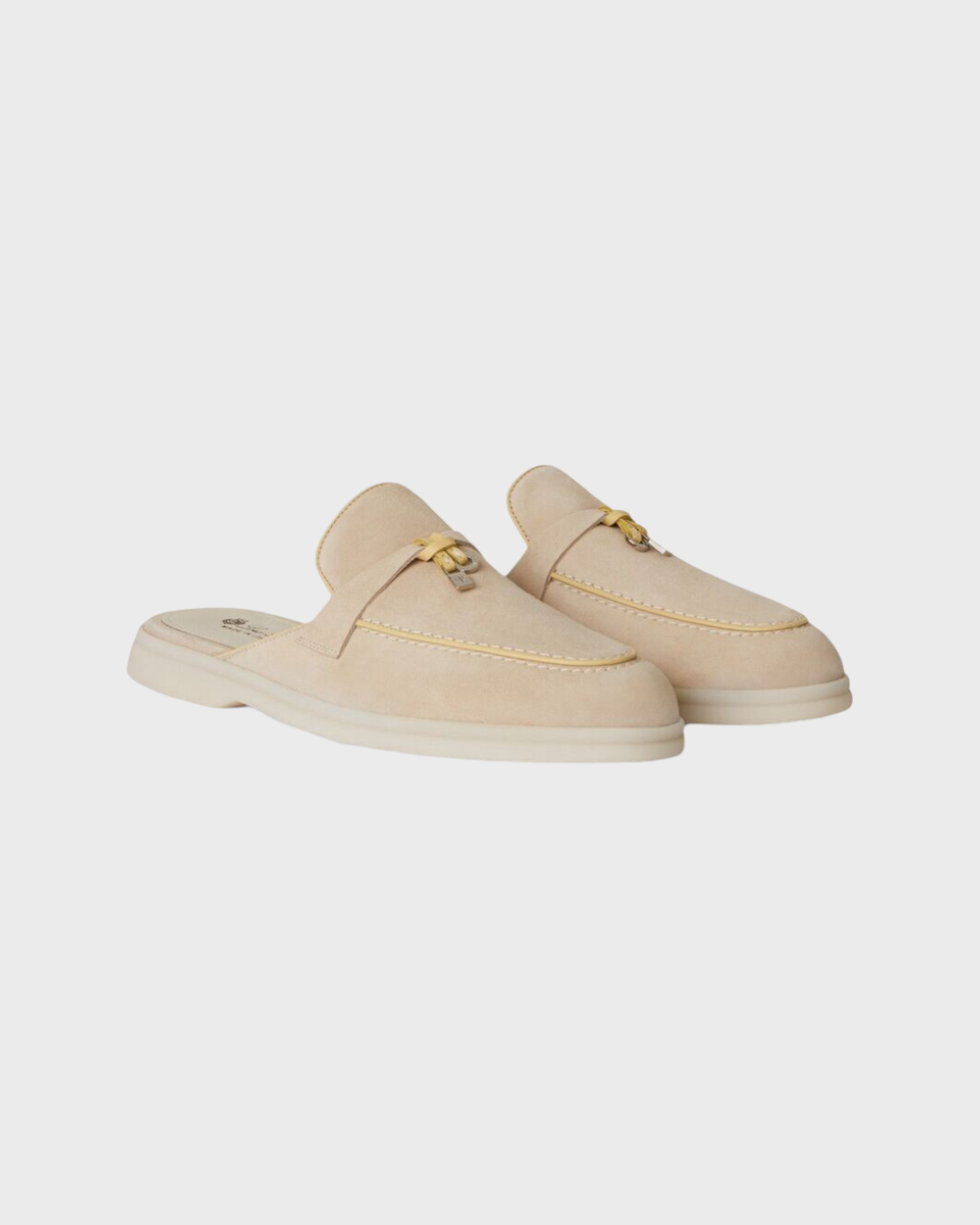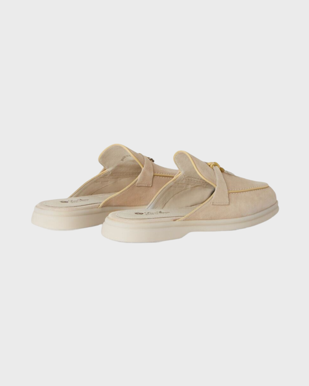 Suede slipper version of the iconic Summer Charms Walk. Nappa leather piping and saddles with Loro Piana My Charms complete the look.