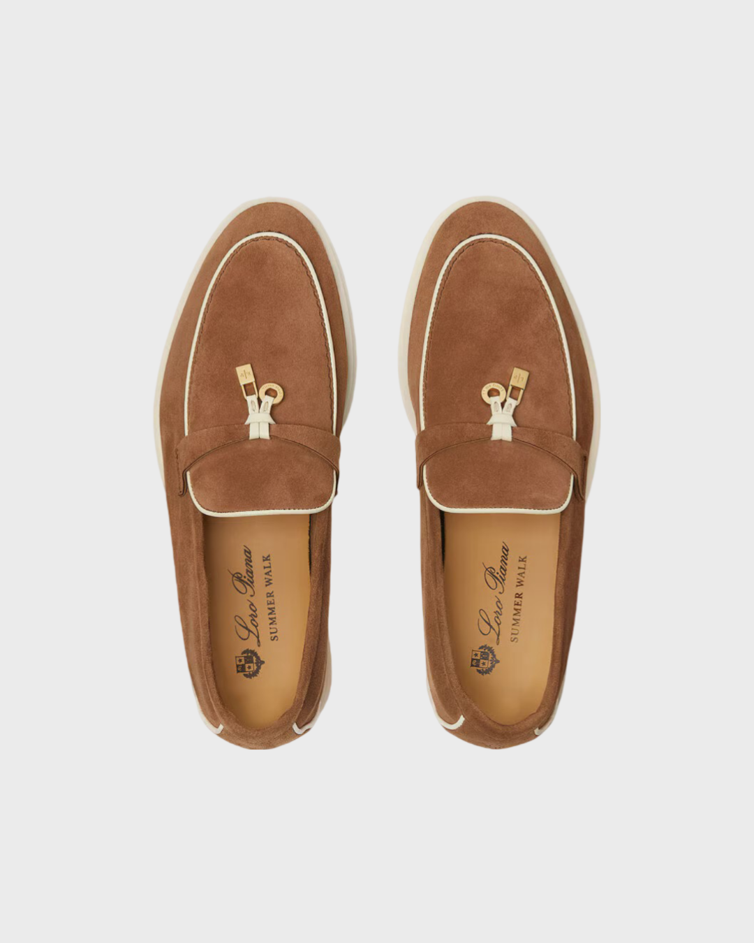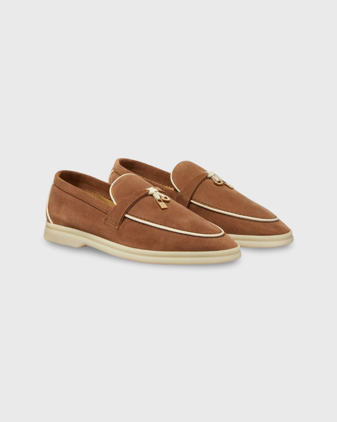 Iconic suede loafers. They feature soft nappa leather piping and suede saddles with Loro Piana My Charms