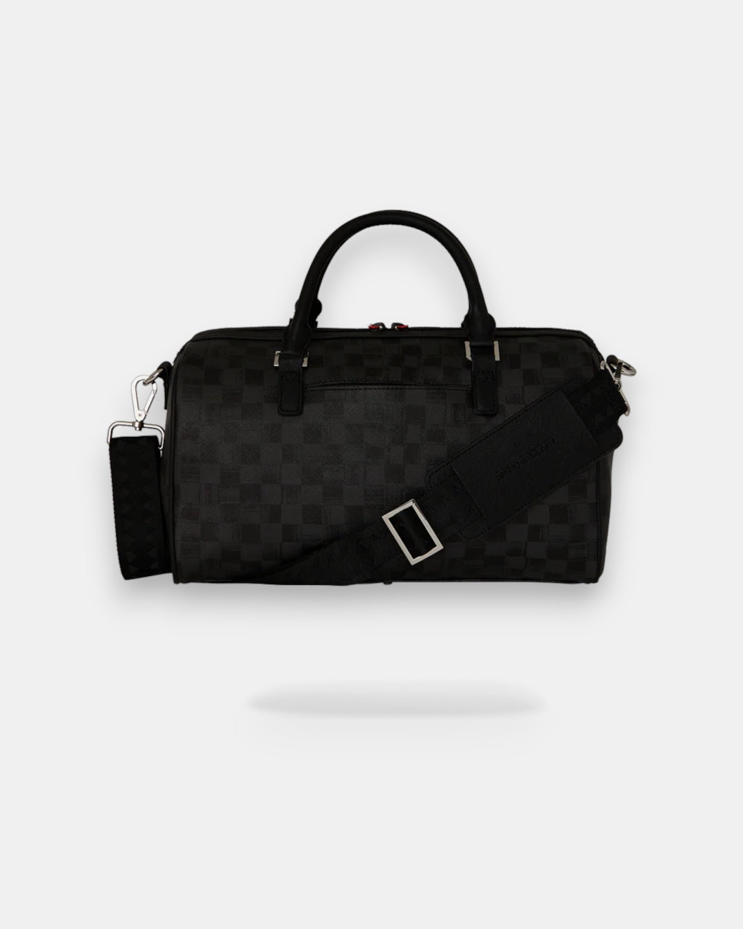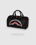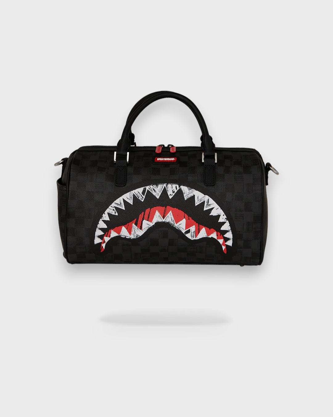 Cut and sew sharkmouth shape with embossed silver foil lettering.