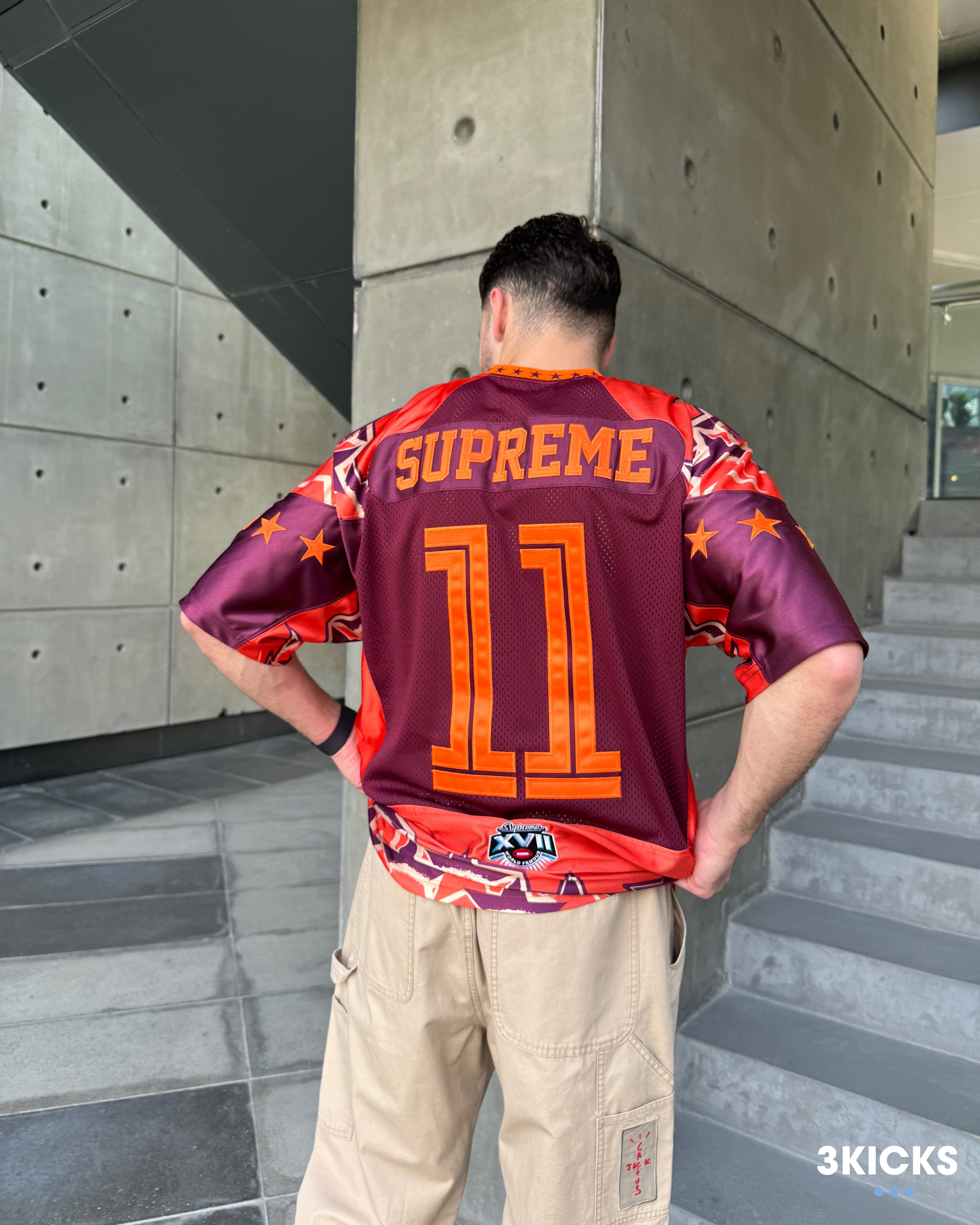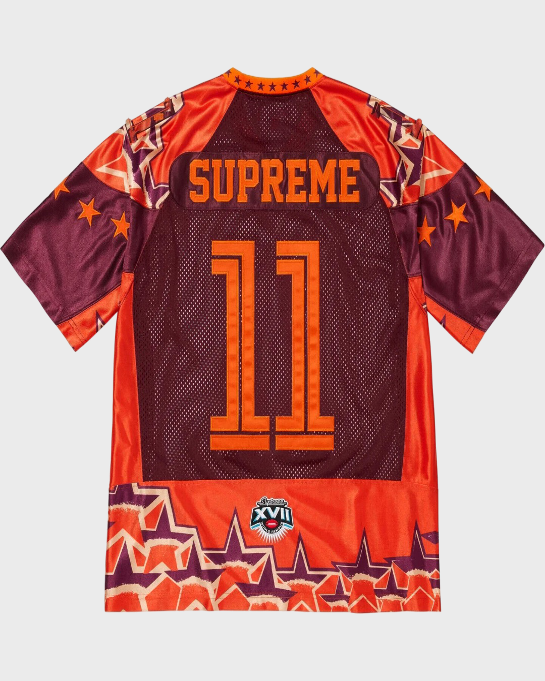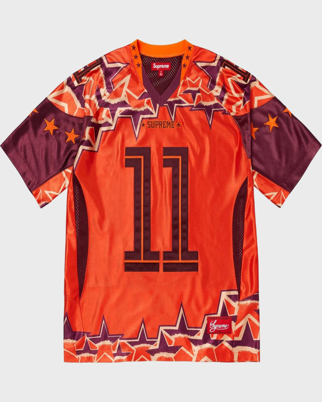The Supreme Stars Football Jersey Orange is a standout piece from Supreme’s Spring/Summer 2025 collection. It features a poly dazzle fabric construction with breathable mesh panels, ensuring both comfort and durability. The jersey includes tackle twill applications on the front, sleeves, and back, along with an embroidered logo on the chest. Additionally, it has an athletic label on the lower front, reinforcing its sportswear aesthetic