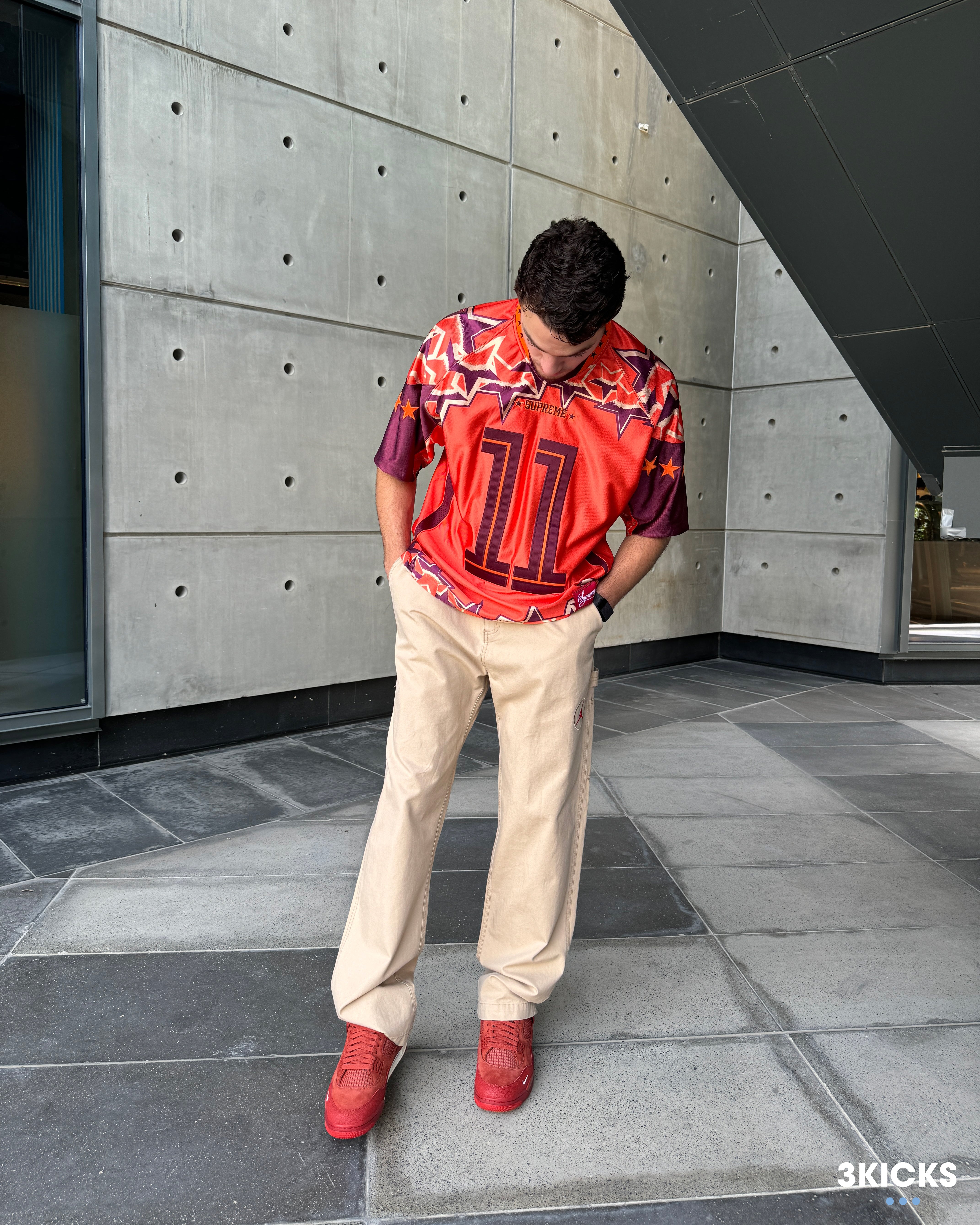 The colorway is bold, combining orange and burgundy, with the number 11 prominently displayed on the front. Its oversized fit and strong branding make it ideal for streetwear styling or as a collector’s piece.