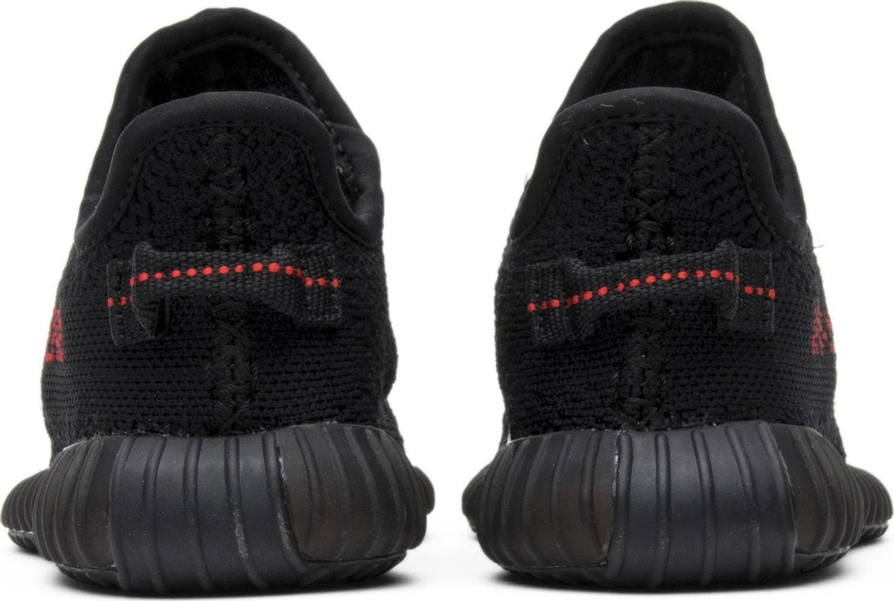 • Design: The overall design of the Yeezy Boost 350 V2 "Black Red" Infants & Kids mirrors the adult version's low-profile silhouette. The black and red colorway, along with the signature SPLY-350 branding, gives it a modern, bold look. The sneaker retains the aesthetic of the 350 V2 line but in a size and fit suited for young feet. Its minimalistic yet striking design makes it a favorite among kids and parents alike.