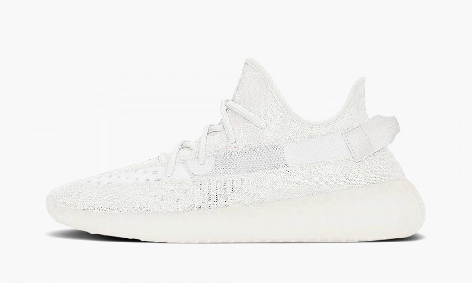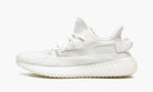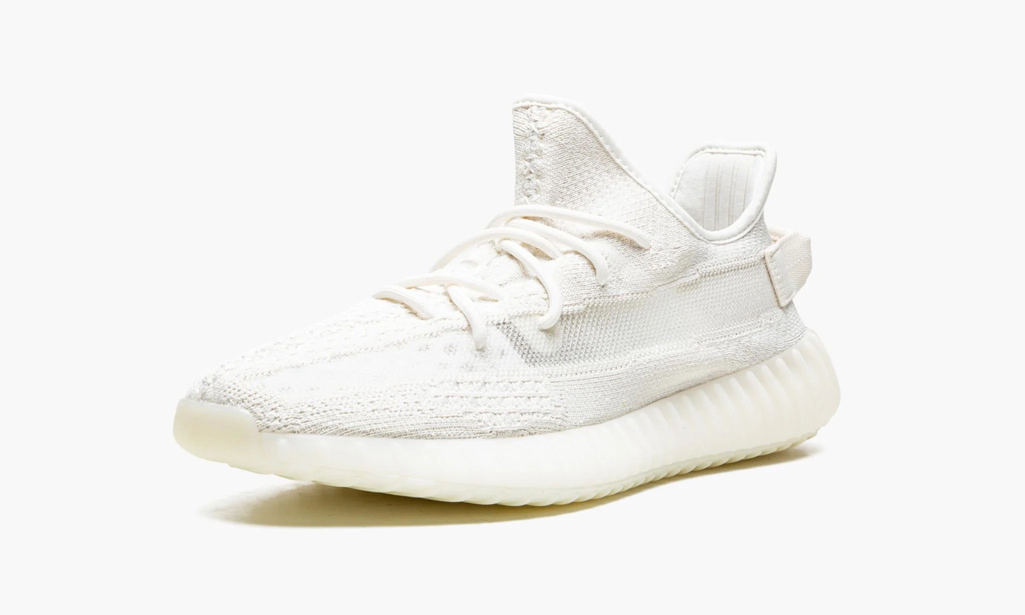 The upper is made from Primeknit, a breathable and flexible material known for its snug, sock-like fit. The bone-whitecolor is uniform throughout the upper, which gives the sneaker a smooth, uniform aesthetic. The Primeknit upper features a slightly textured, woven pattern that adds dimension to the overall look. There is also a translucent striperunning along the side, a hallmark of the Yeezy Boost 350 V2 series, which allows a glimpse of the shoe's inner structure while maintaining the minimal design.