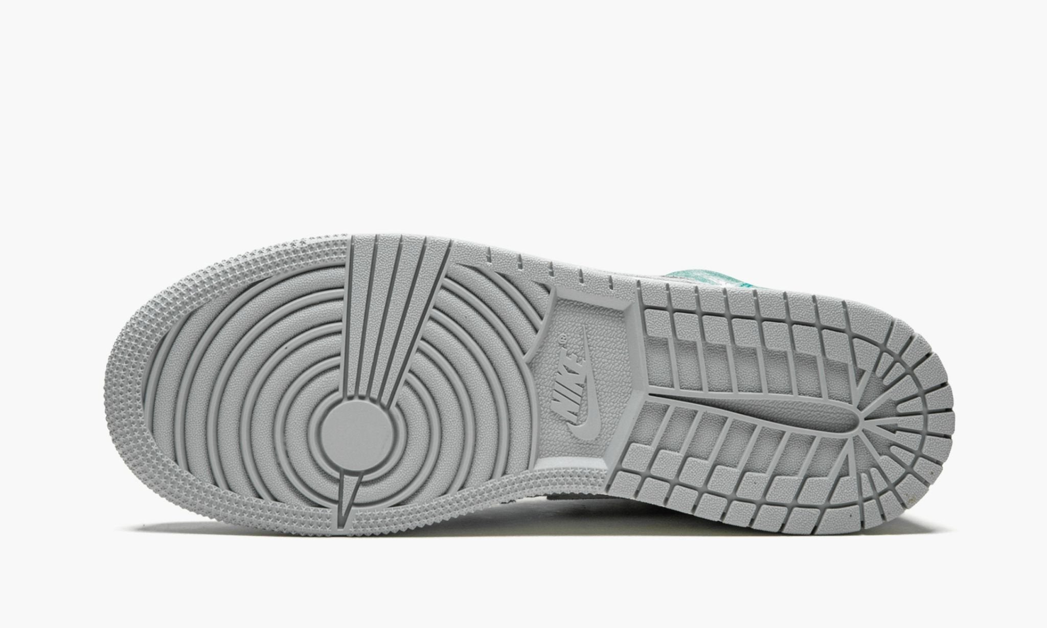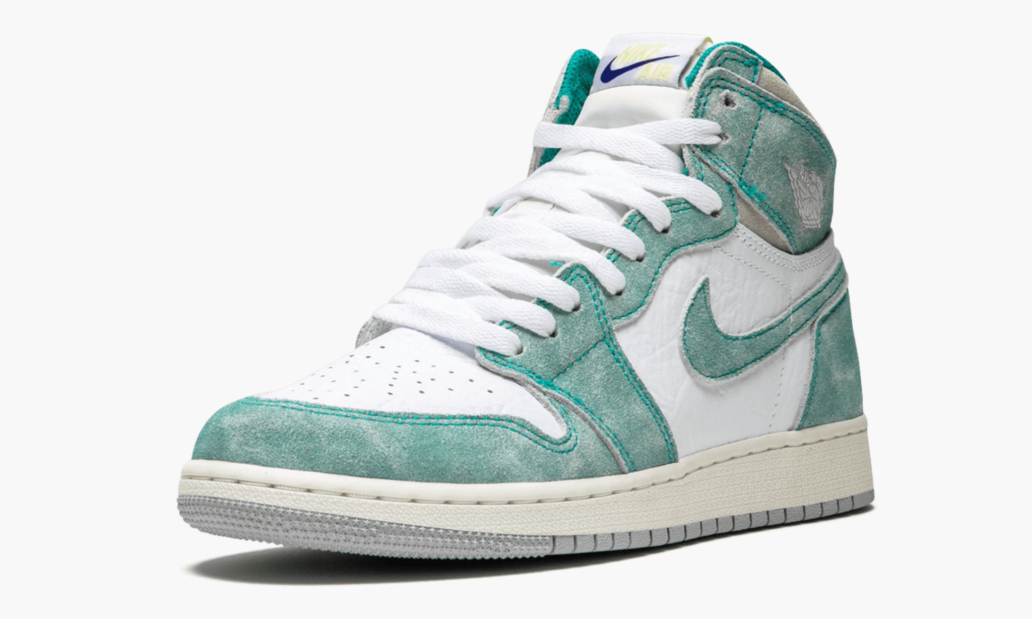 The Air Jordan 1 High “Turbo Green” is a unique colorway for the classic Michael Jordan signature shoe that released as part of the 2019 NBA All-Star collection from Nike and Jordan Brand. The washed leather upper in Turbo Green and white pays tribute to the classic Charlotte Hornets team colors, the host team for the 2019 All-Star game, and gives the shoe a vintage look. A gold and purple Nike logo is found on the tongue, and alternate purple laces are included to add to the Hornets vibe. The upper also features a new detail that appeared on select pairs of Air Jordan 1's in 2019: text of the model name and season of release printed on the midfoot. The Air Jordan 1 High “Turbo Green” released on February 15, 2019.